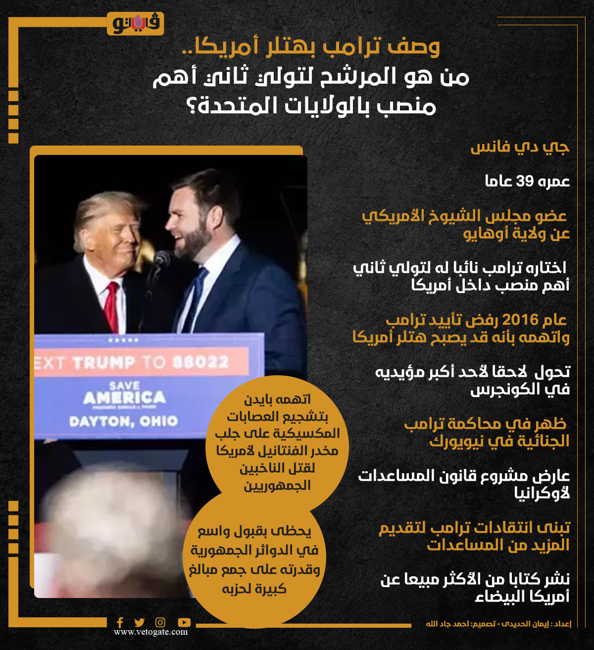 وصف ترامب بهتلر أمريكا.. من هو المرشح لتولي ثاني أهم منصب بالولايات المتحدة؟ (إنفوجراف) الثلاثاء 16/يوليو/2024 - 03:20 م 7/16/2024 3:20:17 PM ترامب ونائبة، فيتو إيمان الحديدى شارك طباعة 18 حجم الخط شارك طباعة المساعدات لأوكرانيا عصابات المكسيك مجلس الشيوخ الأمريكي محاكمة ترامب مجلس الشيوخ أوهايو أمريكا