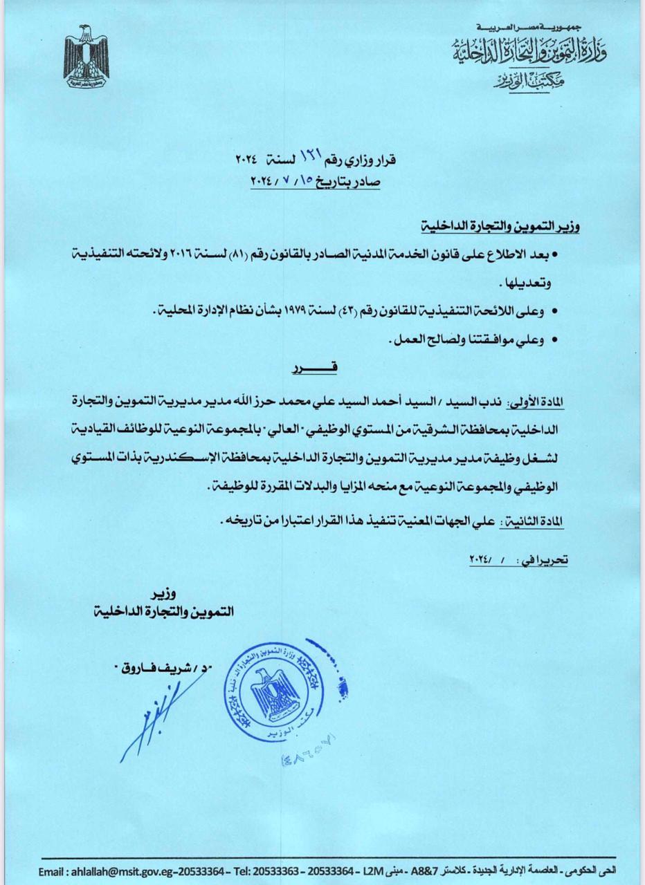 وشهدت مديرية التموين والتجارة الداخلية بالأسكندرية، تغيير مدير المديرية أحمد ابراهيم بقرار من وزير التموين شريف فاروق، ليتولي السيد أحمد حرزالله مهام مدير المديرية قادما من مدير تموين الشرقية، ودون أن تشمل الحركة نقل مدير تموين الإسكندرية لاي جهه.