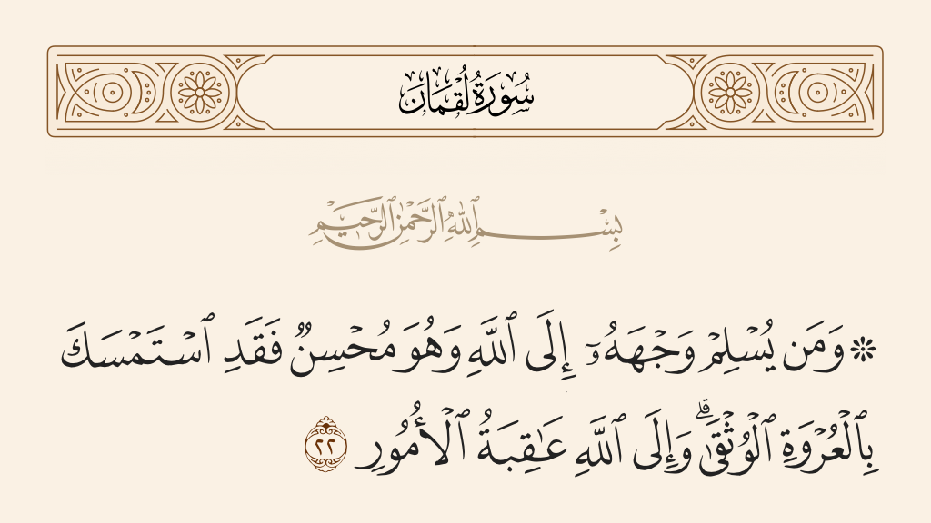 قال تعالى: «وَمَنْ يُسْلِمْ وَجْهَهُ إِلَى اللَّهِ وَهُوَ مُحْسِنٌ فَقَدِ اسْتَمْسَكَ بِالْعُرْوَةِ الْوُثْقى وَإِلَى اللَّهِ عاقِبَةُ الْأُمُورِ».