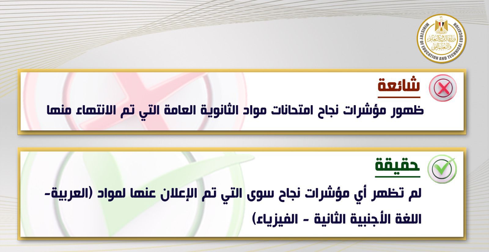 كشفت وزارة التربية والتعليم والتعليم الفني، حقيقة ما يتم تداوله عبر مواقع التواصل الاجتماعي بشأن ظهور مؤشرات نجاح امتحانات مواد الثانوية العامة التي تم الانتهاء منها