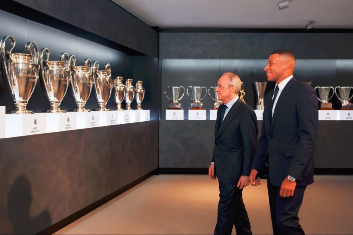 وظهر مبابي اليوم في رفقة رئيس ريال مدريد فلورنتينو بيريز حيث وقع عقود انضمامه للنادي الملكي بعد اجتياز الكشف الطبي للنادي
