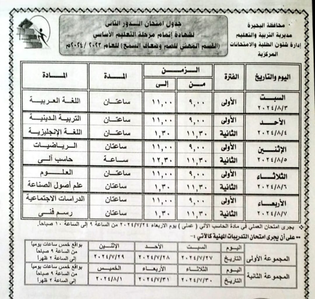 جداول امتحانات الدور الثاني للشهادة الإعدادية بمحافظة البحيرة