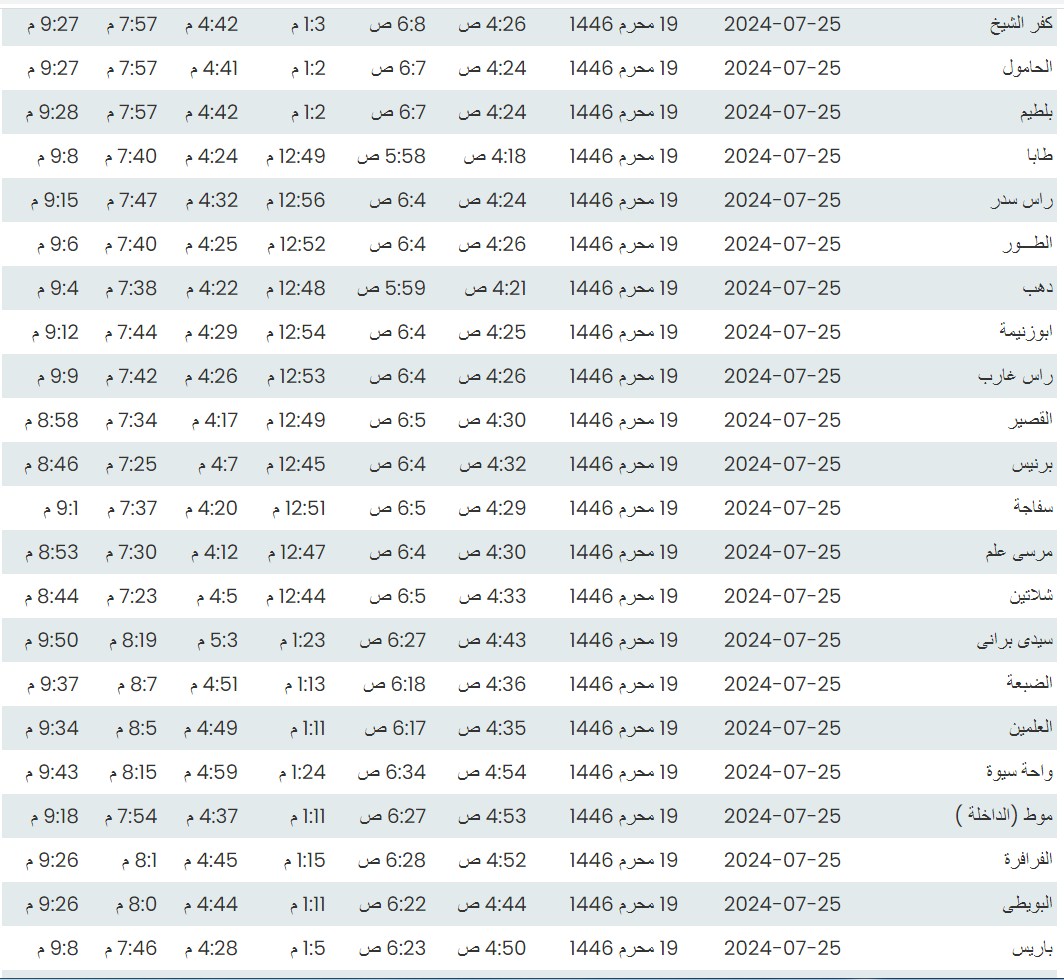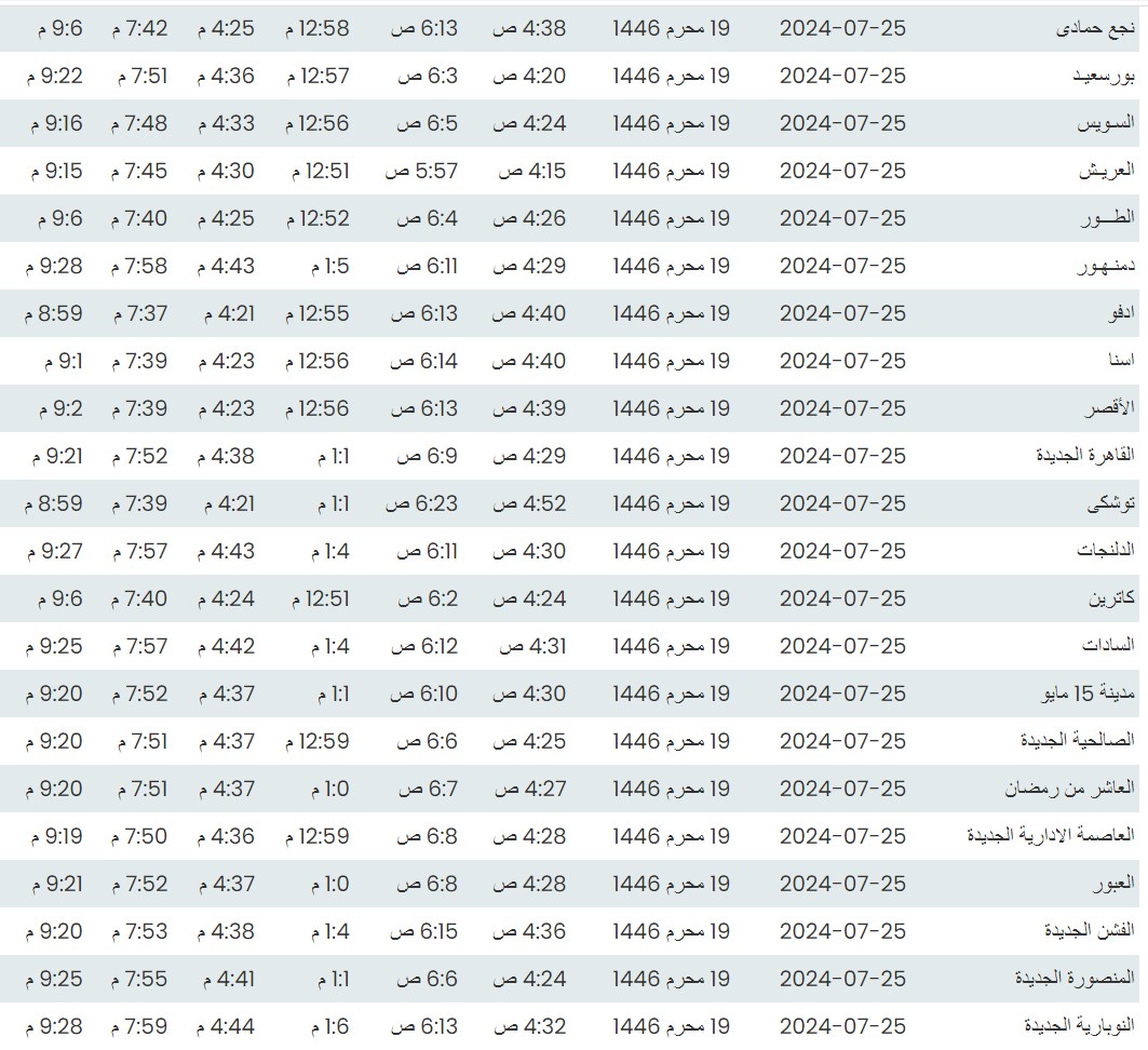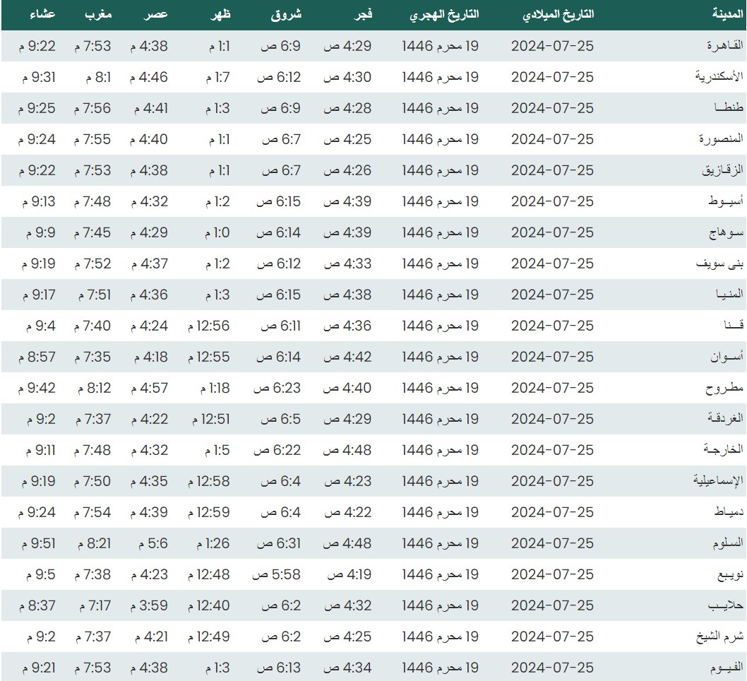 مواقيت الصلاة اليوم وفقًا للتوقيت المحلي لمدينتي القاهرة والإسكندرية وكذلك،مواقيت الصلاة، لعدد من مدن ومحافظات الجمهورية من واقع بيانات الهيئة العامة للمساحة