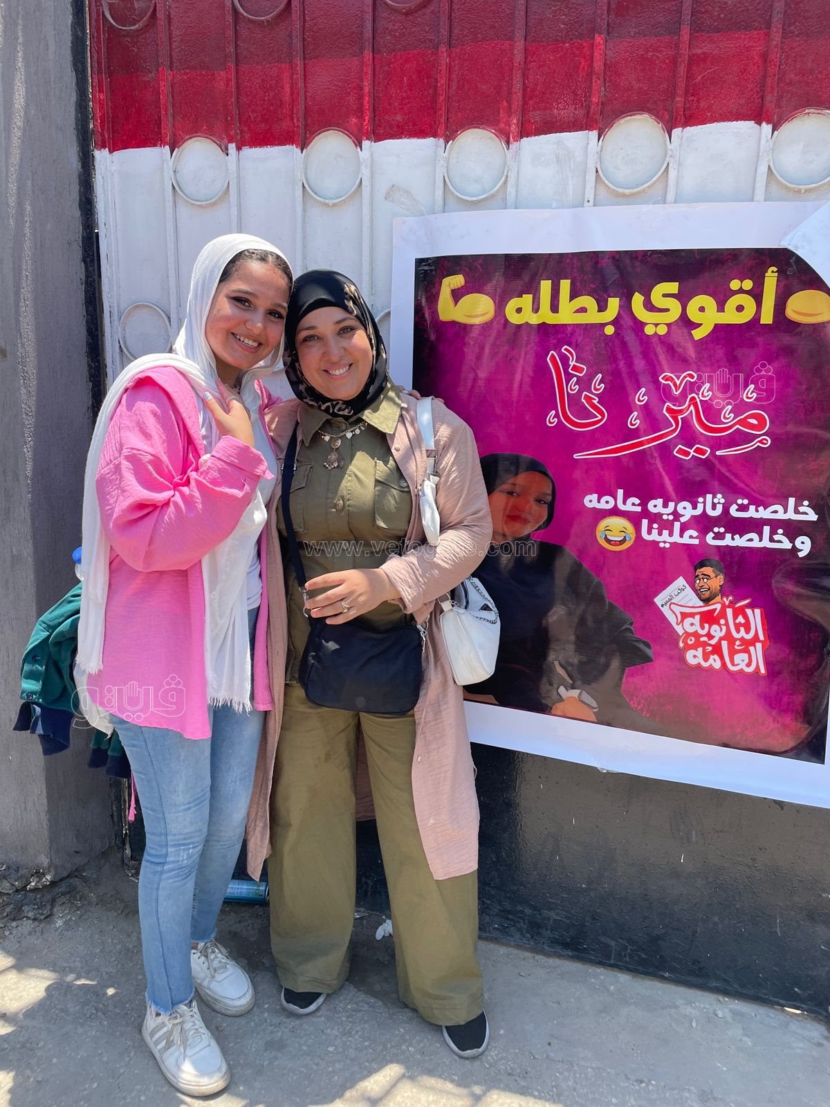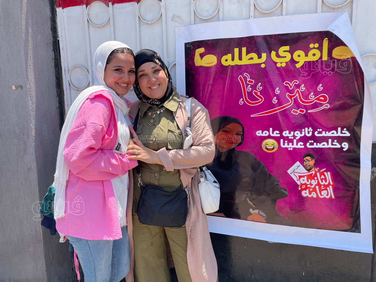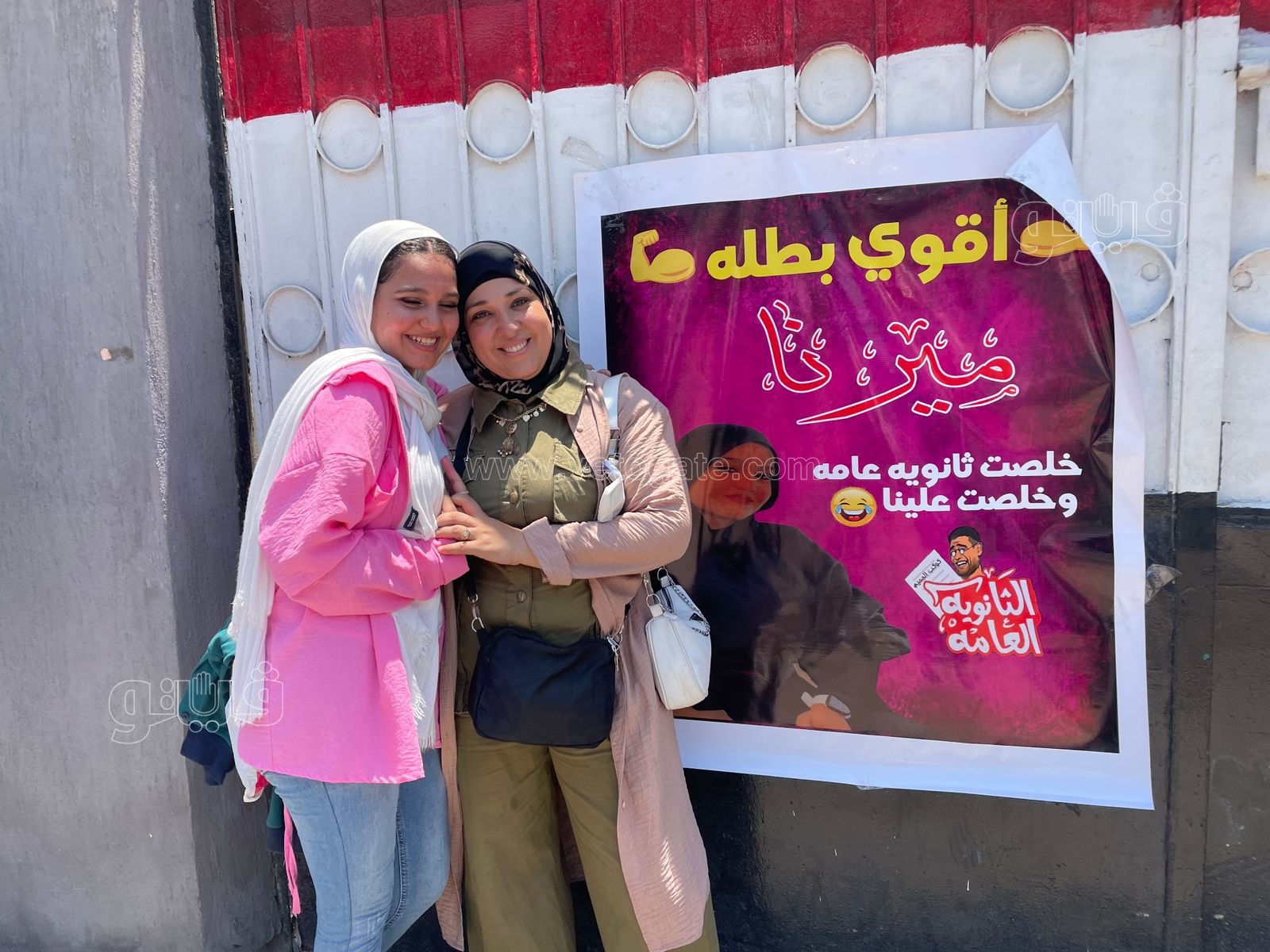 وكتبت والدة الطالبة على البنر: "أقوى بطلة ميرنا خلصت ثانوية عامة وخلصت علينا"، وحرصت والدة الطالبة على التقاط صور مع البنر أمام مقر اللجنة.