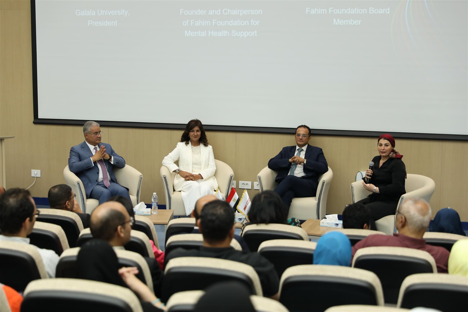 وتبعها عقد جلسة نقاشية عن الدعم النفسي، حيث تحدثت السفيرة نبيلة مكرم، رئيس مجلس أمناء مؤسسة فاهم، والدكتورعبد الناصر عمر، أستاذ الطب النفسي وعضو مجلس أمناء مؤسسة فاهم، والدكتور محمد الشناوي، رئيس جامعة الجلالة، والدكتورة نرمين محمود، أستاذ مشارك علم النفس ومدير مركز السلامة النفسية بجامعة الجلالة.