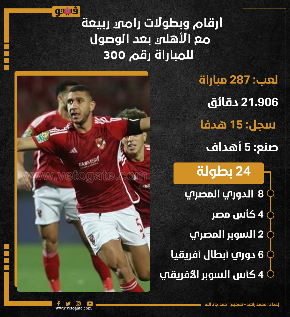 أرقام وبطولات رامي ربيعة مع الأهلي بعد الوصول للمباراة رقم 300 (إنفوجراف) الخميس 18/يوليو/2024 - 05:09 م 7/18/2024 5:09:06 PM رامي ربيعة، فيتو محمد راشد شارك طباعة 18 حجم الخط شارك طباعة الأهلي رامي ربيعة الدوري المصري كأس مصر السوبر المصرى دوري أبطال أفريقيا كأس السوبر الأفريقي