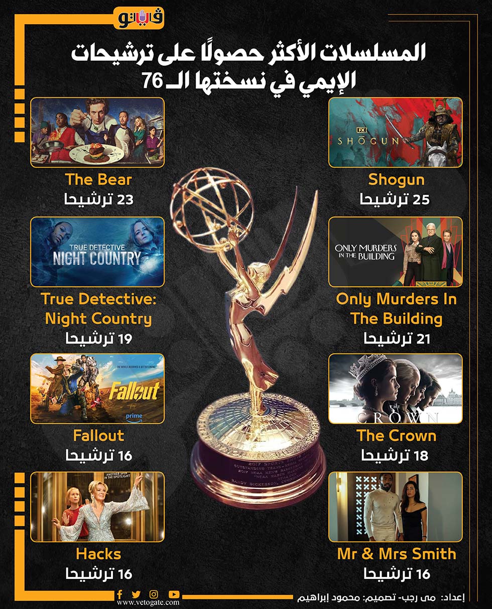 المسلسلات الأكثر حصولًا على ترشيحات الإيمي في نسختها الـ 76 (إنفوجراف) السبت 20/يوليو/2024 - 12:32 م 7/20/2024 12:32:39 PM الإيمي، فيتو مى رجب شارك طباعة 18 حجم الخط شارك طباعة اسماء مرشحي الايمي الإيمي ٧٦ الإيمي ترشيحات الإيمي٢٠٢٤ الإيمي العالمية