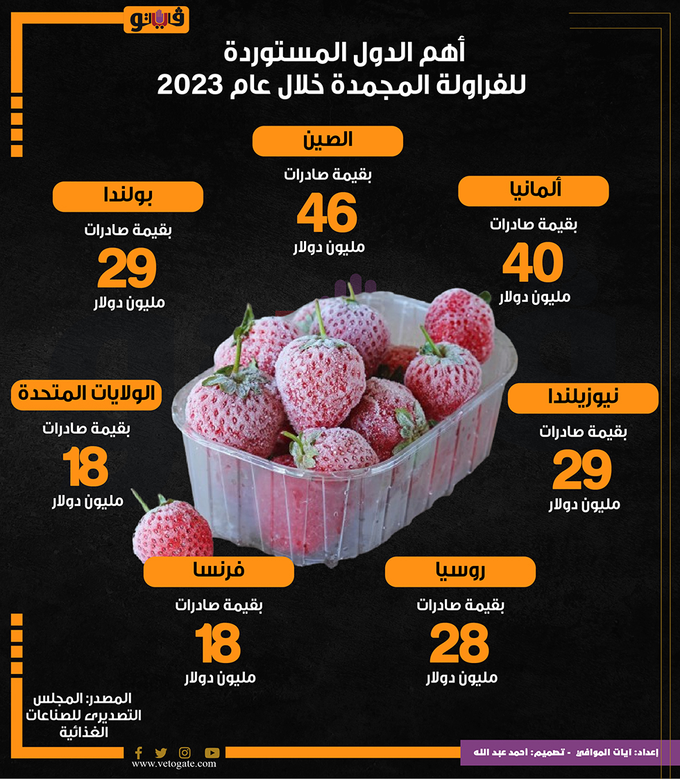 أهم الدول المستوردة للفراولة المجمدة خلال عام 2023 (إنفوجراف) الإثنين 22/يوليو/2024 - 09:31 ص 7/22/2024 9:31:02 AM صورة أرشيفية آيات الموافى شارك طباعة 18 حجم الخط شارك طباعة لفراولة المجمدة الصين ألمانيا
