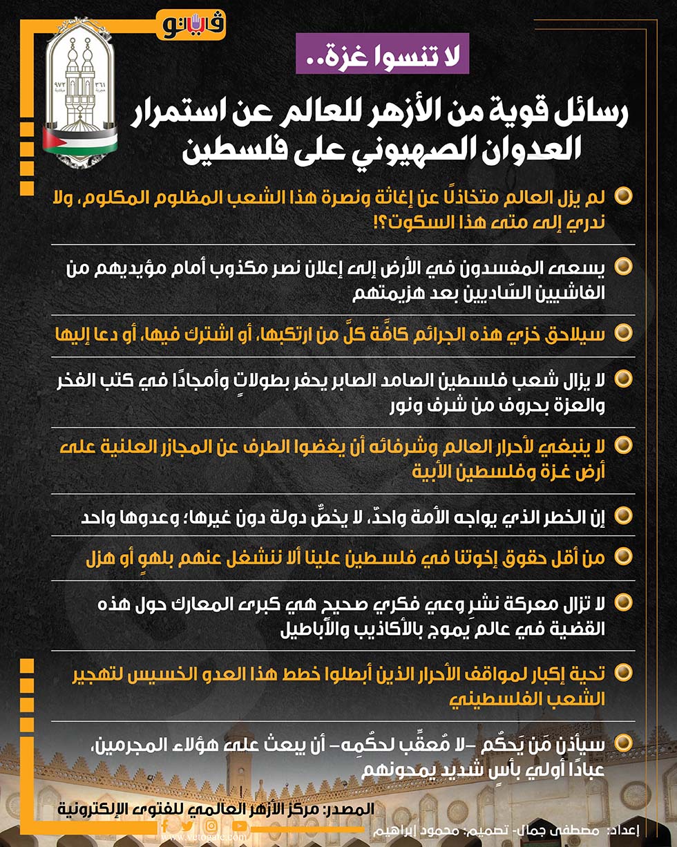 لا تنسوا غزة.. رسائل قوية من الأزهر للعالم عن استمرار العدوان الصهيوني على فلسطين (إنفوجراف) الخميس 18/يوليو/2024 - 03:15 م 7/18/2024 3:15:37 PM العدوان الصهيوني على أهالي فلسطين مصطفى جمال شارك طباعة 18 حجم الخط شارك طباعة الشعب الفلسطيني تهجير الشعب الفلسطيني غزة وفلسطين فلسطين شعب فلسطين