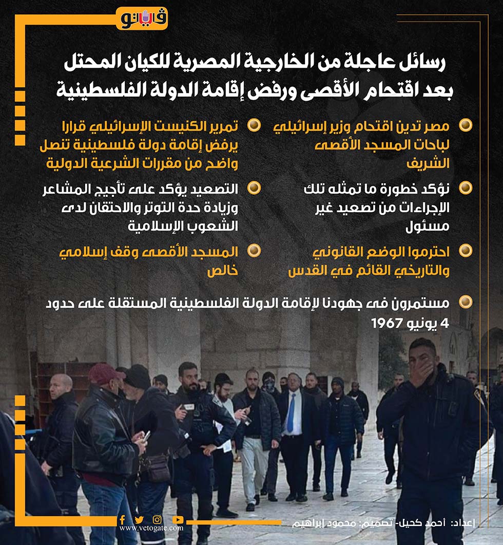رسائل عاجلة من الخارجية المصرية للكيان المحتل بعد اقتحام الأقصى ورفض إقامة الدولة الفلسطينية (إنفوجراف) الخميس 18/يوليو/2024 - 03:30 م 7/18/2024 3:30:18 PM الأقصى، فيتو أحمد كحيل شارك طباعة 18 حجم الخط شارك طباعة المسجد الأقصى الشريف دولة فلسطينية إقامة الدولة الفلسطينية