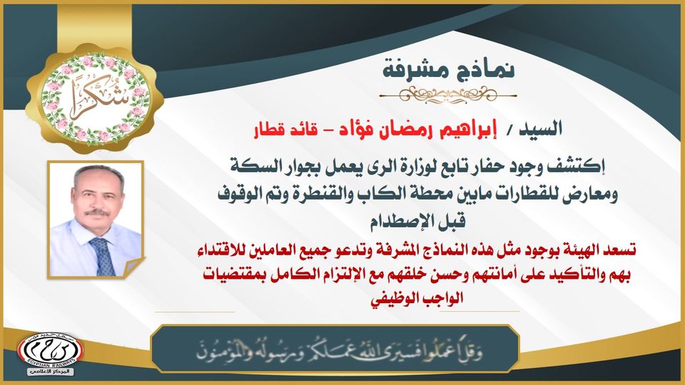 كرمت الهيئة القومية للسكك الحديدية إبراهيم فؤاد قائد إحدى قطارات السكك الحديدية، بعد أن اكتشف وجود حفار تابع لوزارة الري يعمل بجوار السكة ومعارض للقطارات ما بين محطة الكاب والقنطرة ونجح السائق في إيقاف القطار قبل الاصطدام.