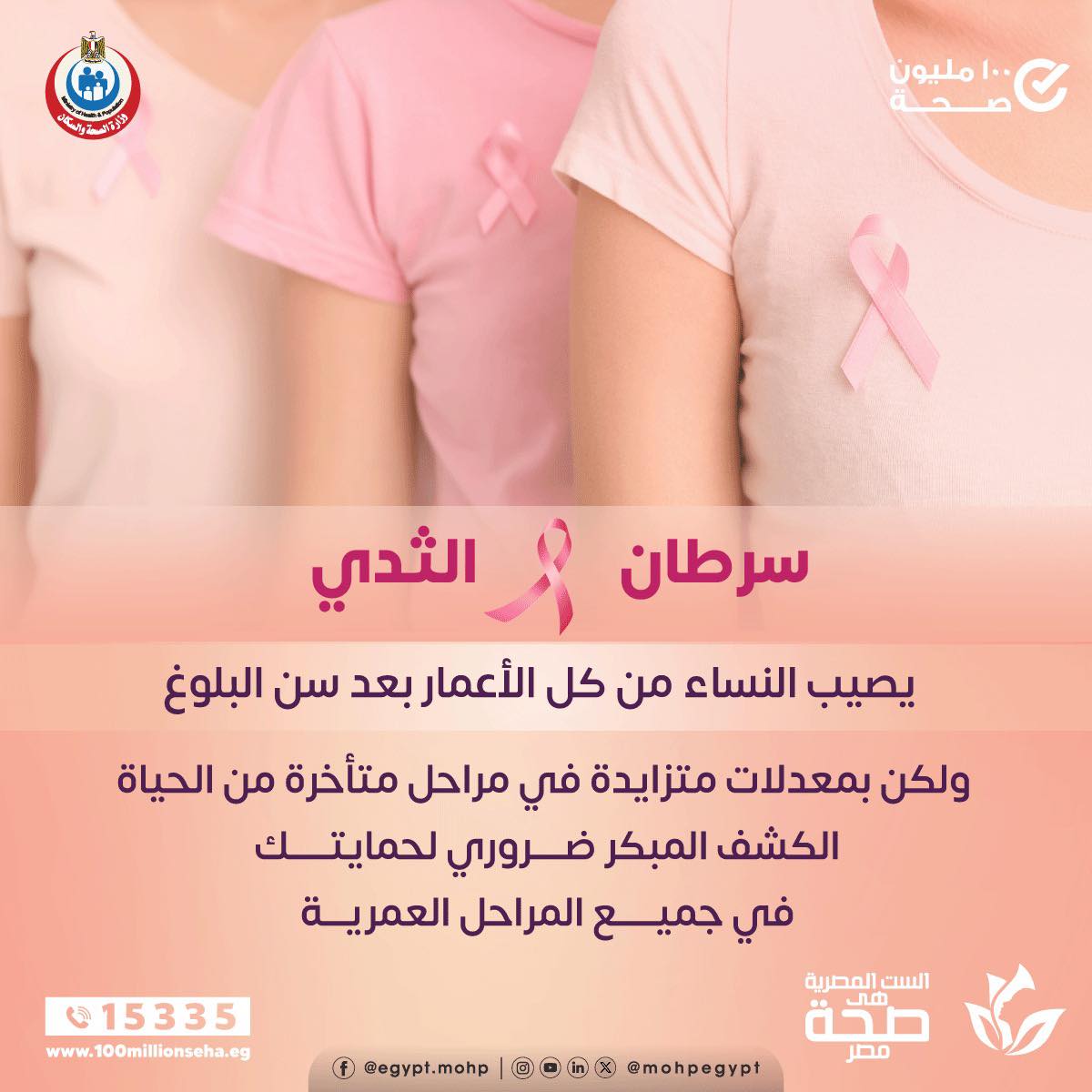 حذرت وزارة الصحة من تجاهل أعراض الإصابة بسرطان الثدي، مشيرة إلى أن سرطان الثدي يصيب النساء من كل الأعمار بعد سن البلوغ ولكن تزيد نسب الإصابة في مراحل متأخرة من الحياة، لذلك الكشف المبكر مهم لاكتشاف المرض وعلاجه بطريقة أسرع.