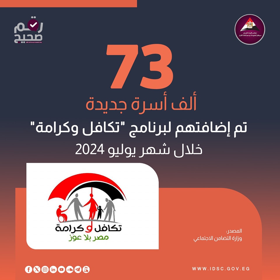 معلومات الوزراء: إضافة 73 ألف أسرة لبرنامج تكافل وكرامة خلال يوليو