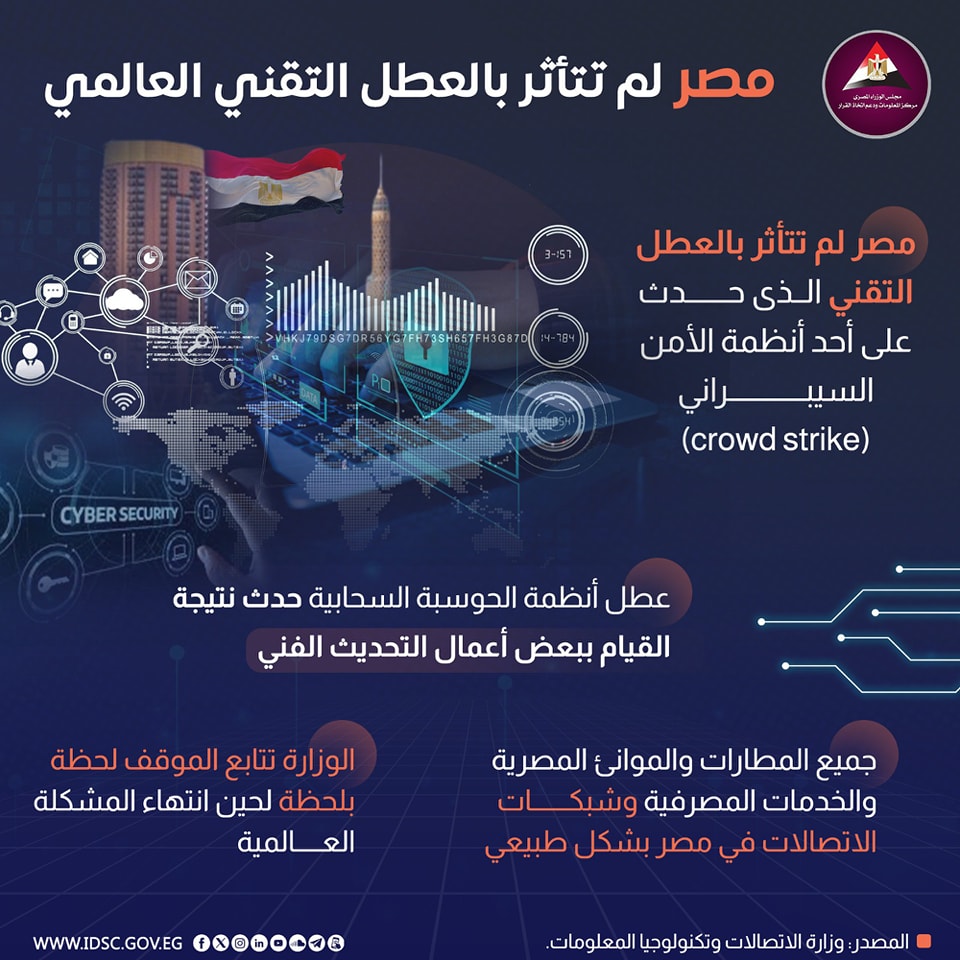 وأكدت وزارة الاتصالات وتكنولوجيا المعلومات عدم تأثر جمهورية مصر العربية بالعطل التقنى الذى حدث على أحد أنظمة الأمن السيبرانى (crowd strike) العاملة على أنظمة الحوسبة السحابية نتيجة القيام ببعض أعمال التحديث الفنى.