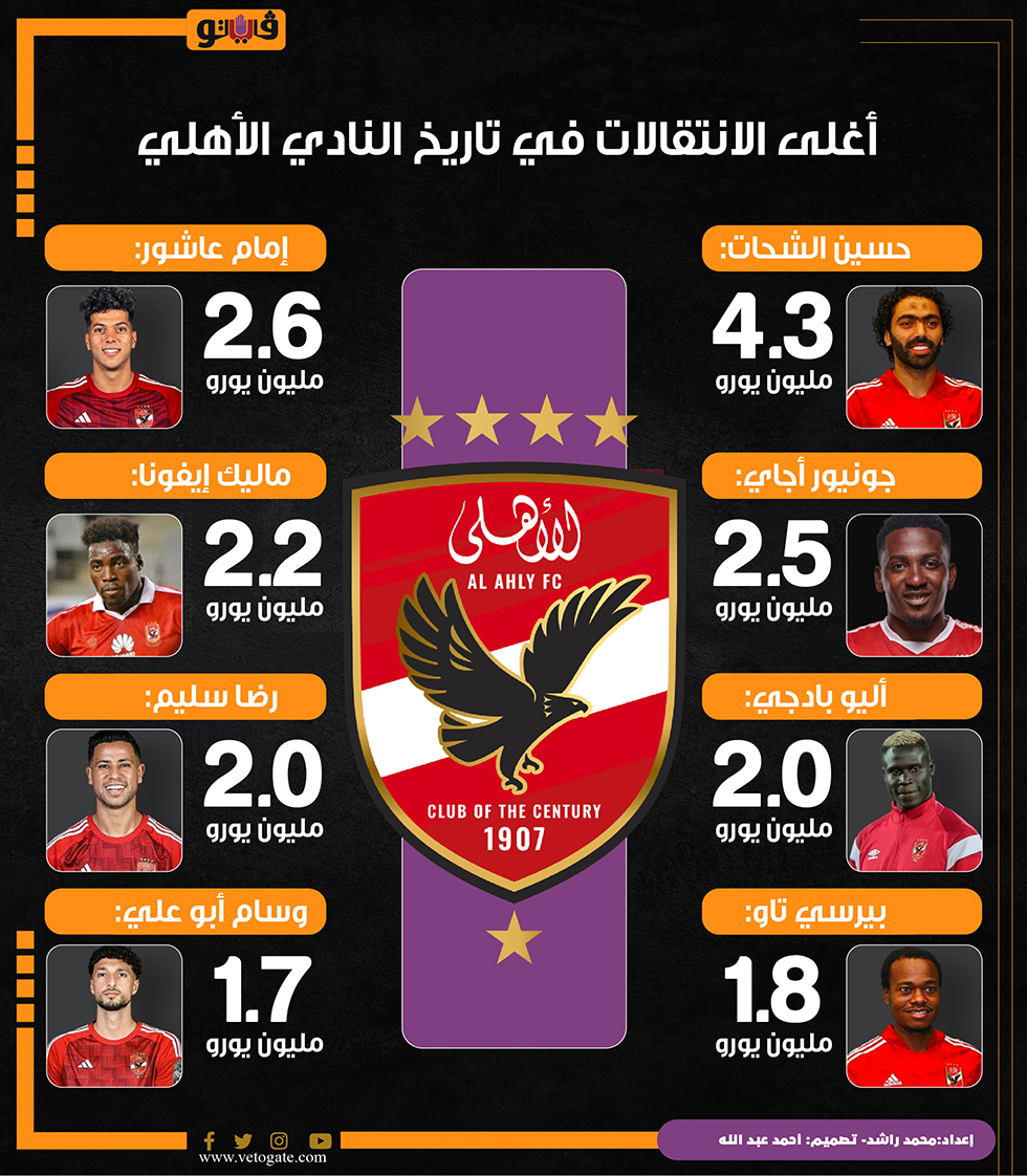 أغلى الانتقالات في تاريخ النادي الأهلي (إنفوجراف) الأحد 28/يوليو/2024 - 01:15 م 7/28/2024 1:15:43 PM الأهلي، فيتو محمد راشد شارك طباعة 18 حجم الخط شارك طباعة حسين الشحات إمام عاشور جونيور أجاي ماليك ايفونا اليو بادجى رضا سليم بيرسي تاو وسام أبو علي