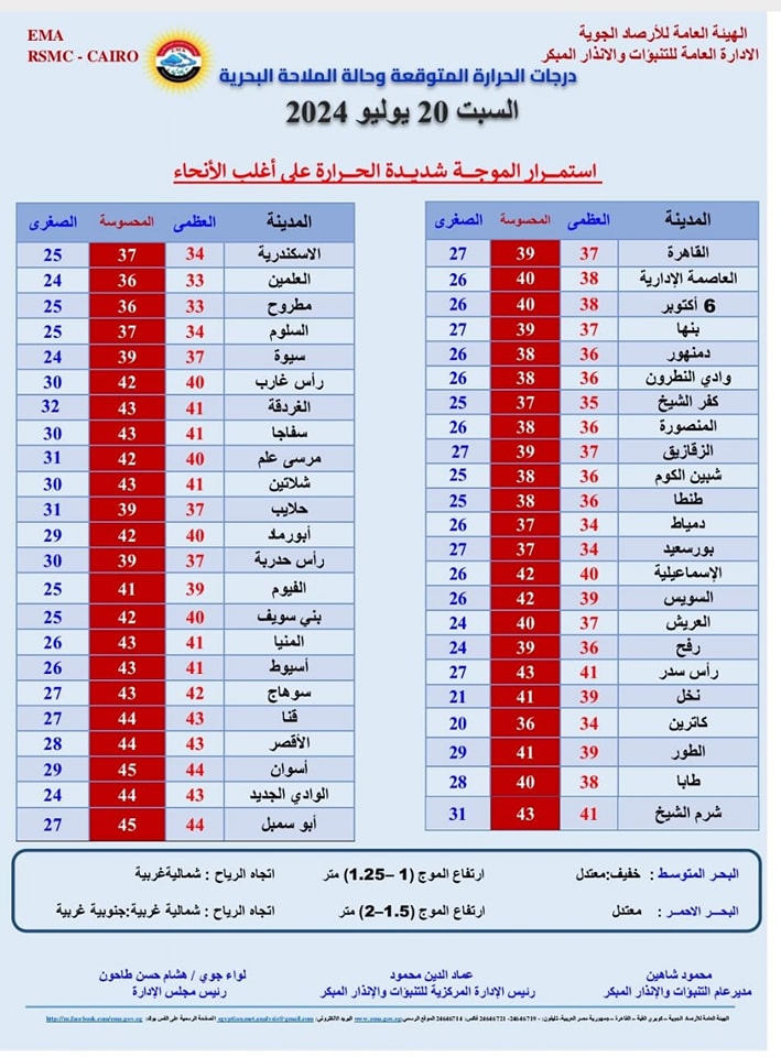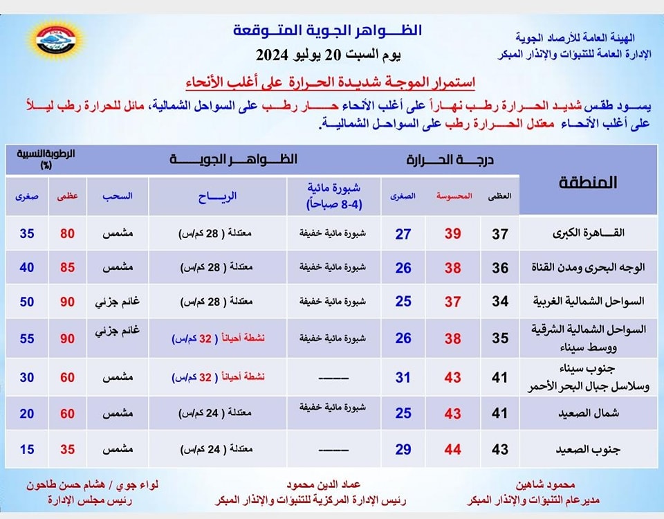أعلنتِ هيئة الأرصاد الجوية حالة الطقس اليوم السبت 20 يوليو 2024، استمرار الموجة شديدة الحرارة على أغلب الأنحاء.