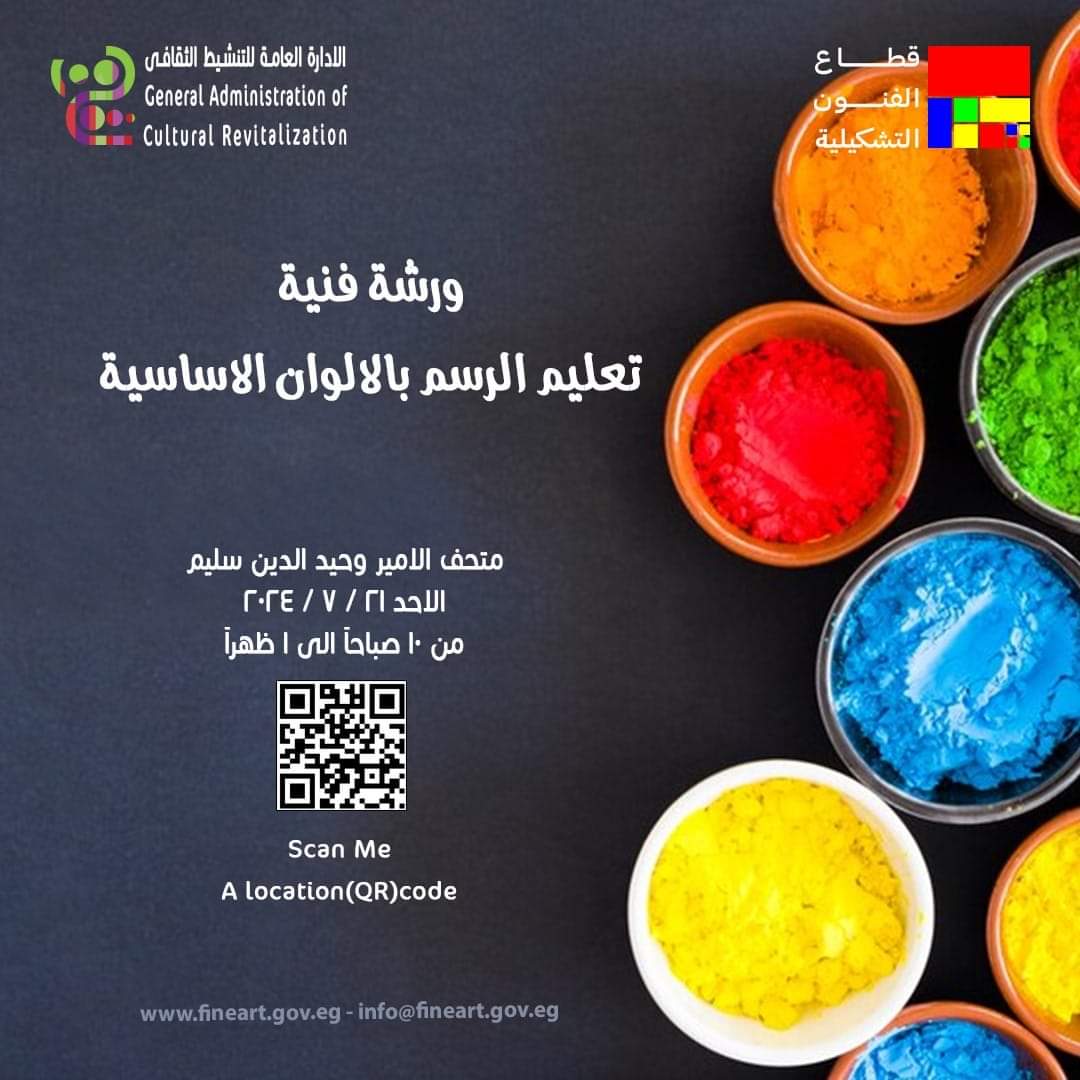 ويقيم قطاع الفنون التشكيلية بمتحف الأمير وحيد سليم، وتحت رعاية الدكتور أحمد فؤاد هنو وزير الثقافة، ورشة فنية بعنوان "تعليم الرسم بالألوان الأساسية".