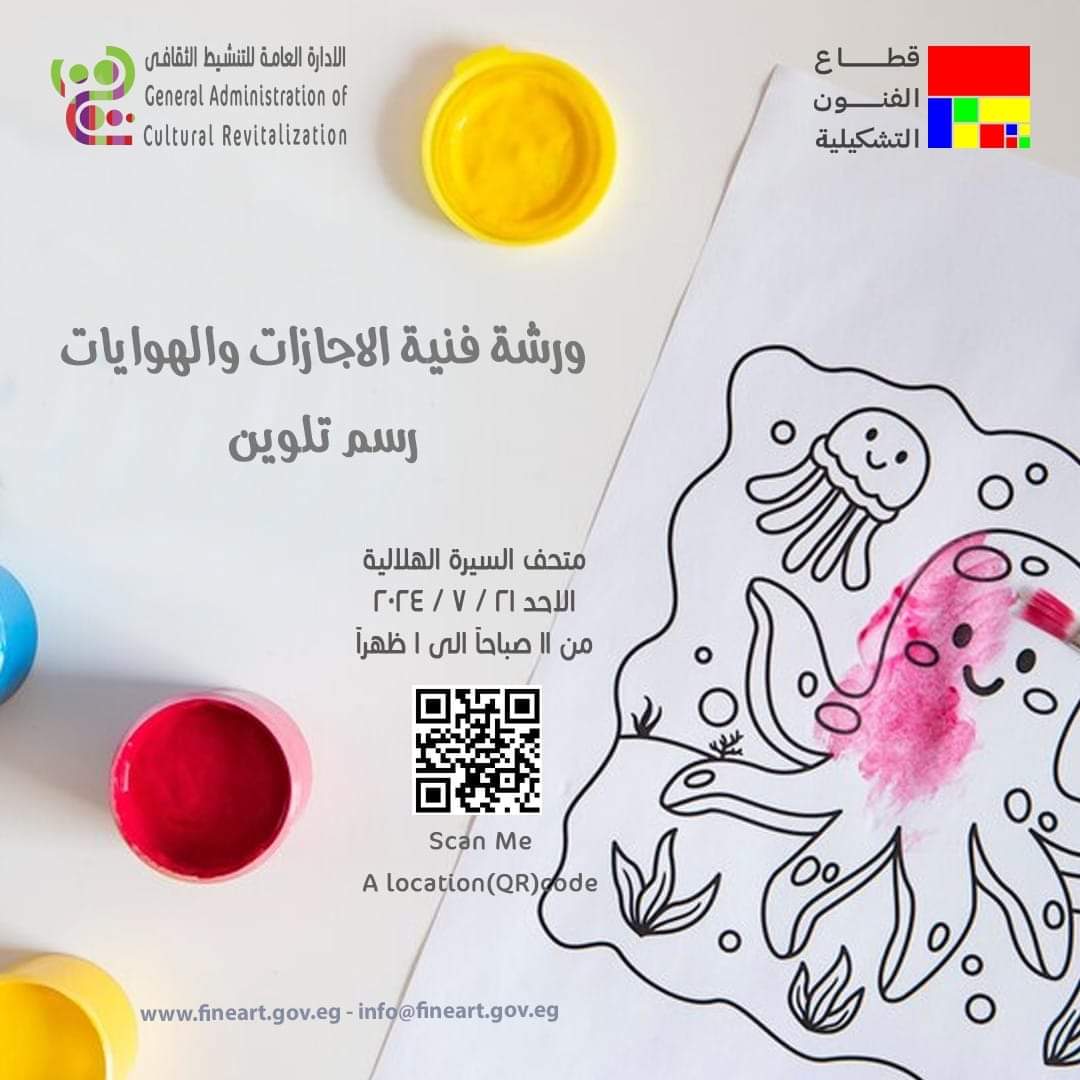 أعلن قطاع الفنون التشكيلية برئاسة الدكتور وليد قانوش عن إقامة ورشتان فنيتين بالمتاحف المختلفة بمناسبة الاجازة الصيفية، وذلك صباح الغد الموافق الأحد 21 يوليو الجاري.