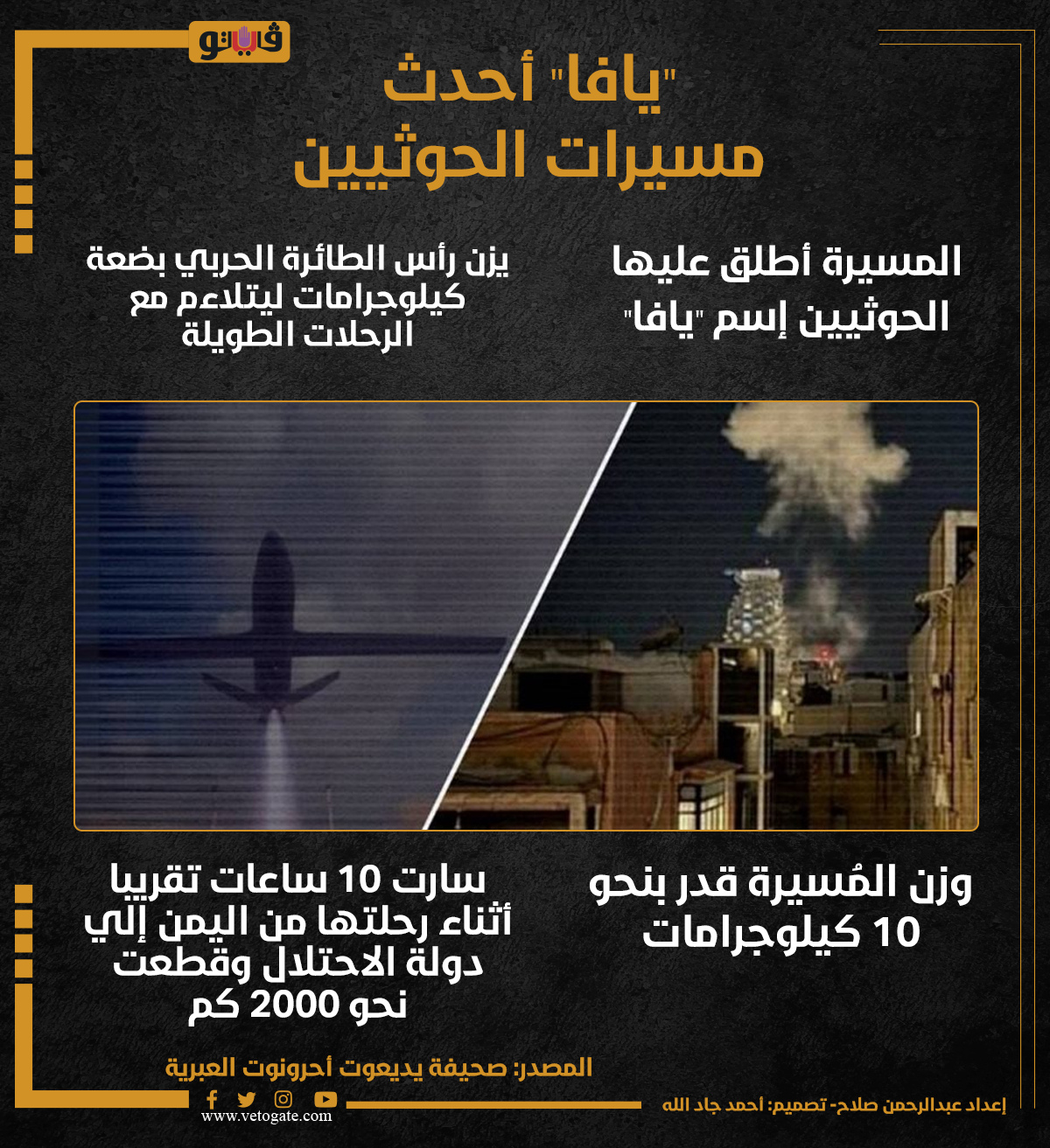 "يافا" أحدث مسيرات الحوثيين (إنفوجراف) الثلاثاء 23/يوليو/2024 - 02:00 م 7/23/2024 2:00:40 PM المسيرة يافا، فيتو عبدالرحمن صلاح شارك طباعة 18 حجم الخط شارك طباعة يافا الحوثيين اليمن دولة الإحتلال المسيرة يافا مسيرات الحوثيين