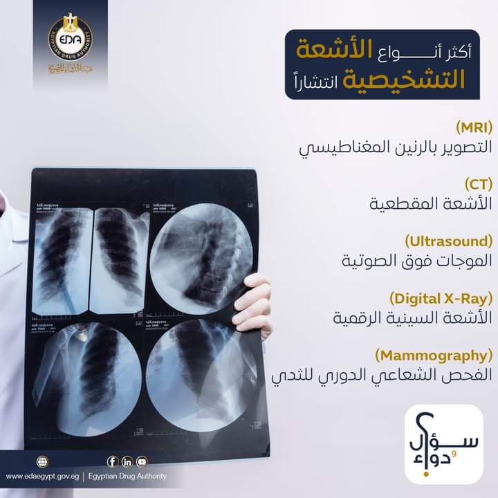 اوضحت هيئة الدواء المصرية أن أكثر أنواع الأشعة التشخيصية انتشارًا تشمل: