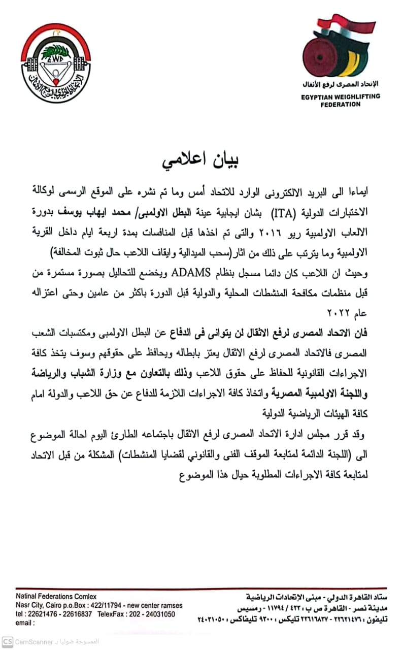 وجاء بيان اتحاد رفع الأثقال كالتالي: