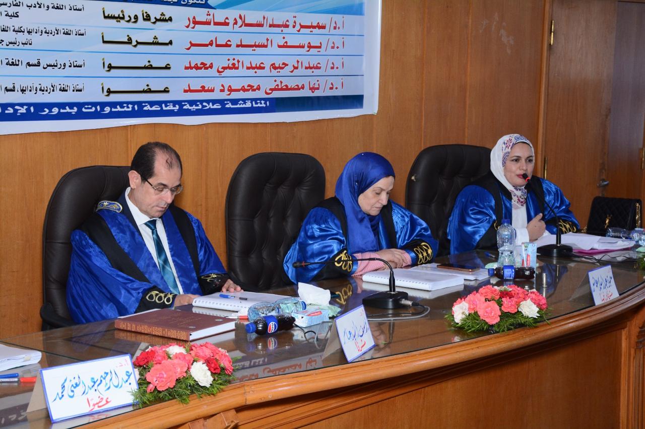 وتكونت لجنة المناقشة من أ.د سميرة عبد السلام عاشور، أستاذة اللغة والأدب الفارسي والرئيس الأسبق لقسم اللغات الشرقية وآدابها بجامعة الإسكندرية، مشرفا ورئيسا، أ.د يوسف السيد عامر، أستاذ اللغة الأردية وآدابها بكلية اللغات والترجمة بجامعة الأزهر، رئيس لجنة الشؤون الدينية والأوقاف بمجلس الشيوخ، مشرفًا، وعضوية: أ.د عبد الرحيم عبد الغني محمد، أستاذ ورئيس قسم اللغة الأبدية بكلية اللغات والترجمة بجامعة الأزهر، أ.د نها مصطفى محمود، أستاذ اللغة الأردية وآدابها بكلية الدراسات الإنسانية بجامعة الأزهر.