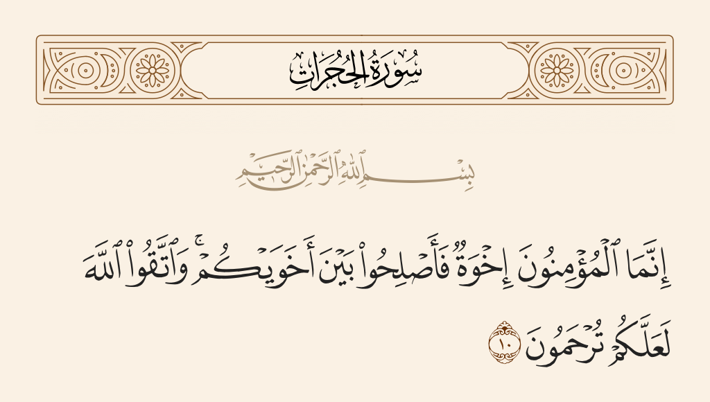 قال تعالى: «إِنَّمَا الْمُؤْمِنُونَ إِخْوَةٌ فَأَصْلِحُوا بَيْنَ أَخَوَيْكُمْ وَاتَّقُوا اللَّهَ لَعَلَّكُمْ تُرْحَمُونَ».
