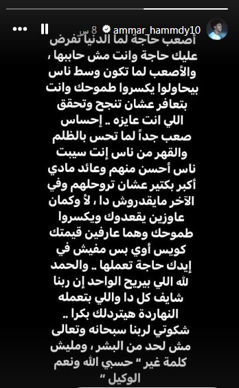 وكتب عمار حمدي عبر ستوري انستجرام: “ أصعب حاجة لما الدنيا تفرض عليك حاجة وأنت مش حاببها والأصعب لما تكون وسط ناس بيحاولوا يكسروا طموحك وأنت بتعافر عشان تنجح وتحقق اللي إنت عايزه”.