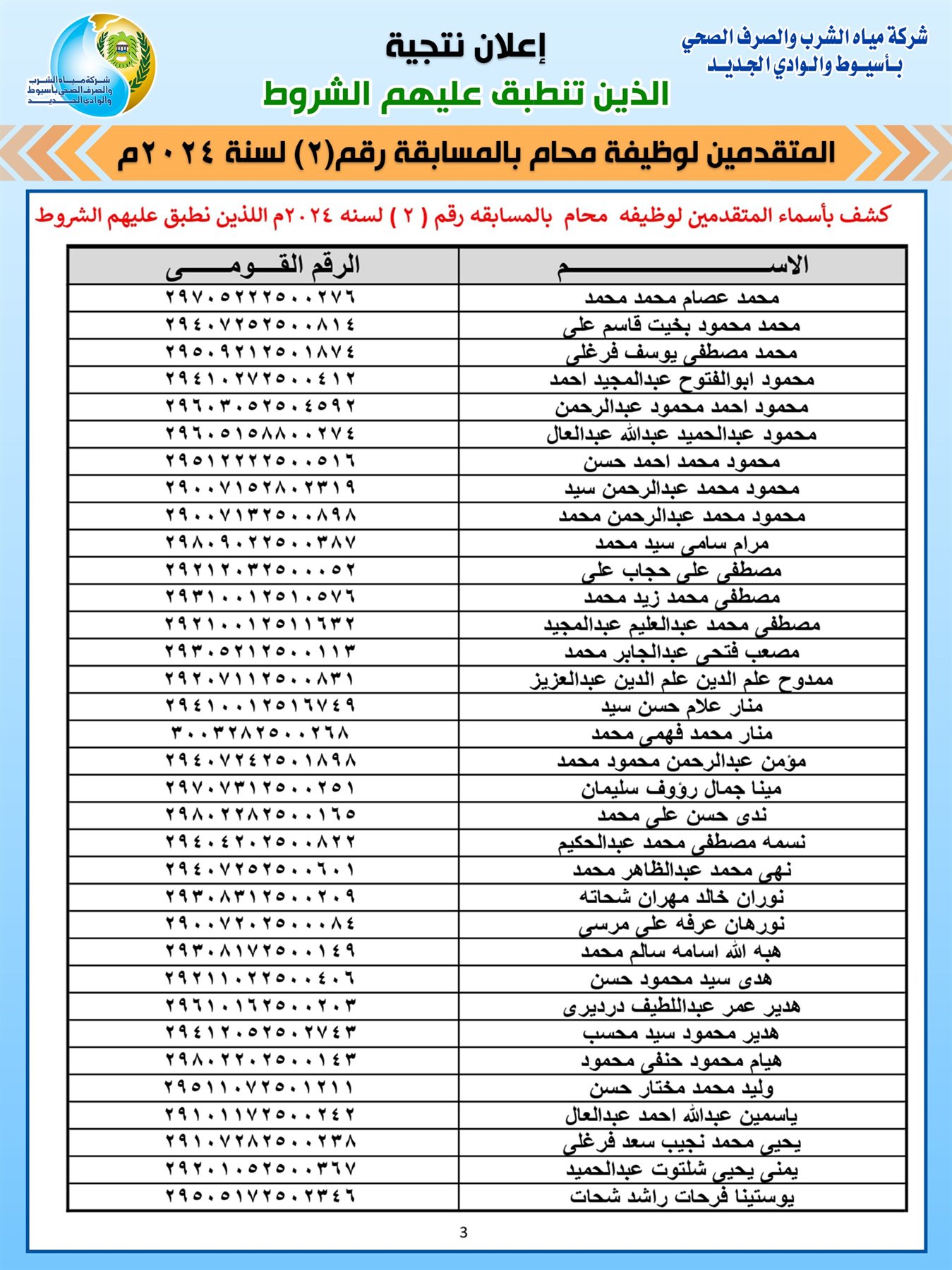 أعلنت شركة مياه الشرب والصرف الصحي بأسيوط والوادى الجديد اليوم الأحد، اسماء المنطبق والغير منطبق عليهم شروط القبول بمسابقة المحامين للعمل بالشركة والتى تم الإعلان عنها سابقا فى الإعلان رقم ( 2 ) لسنة 2024م.