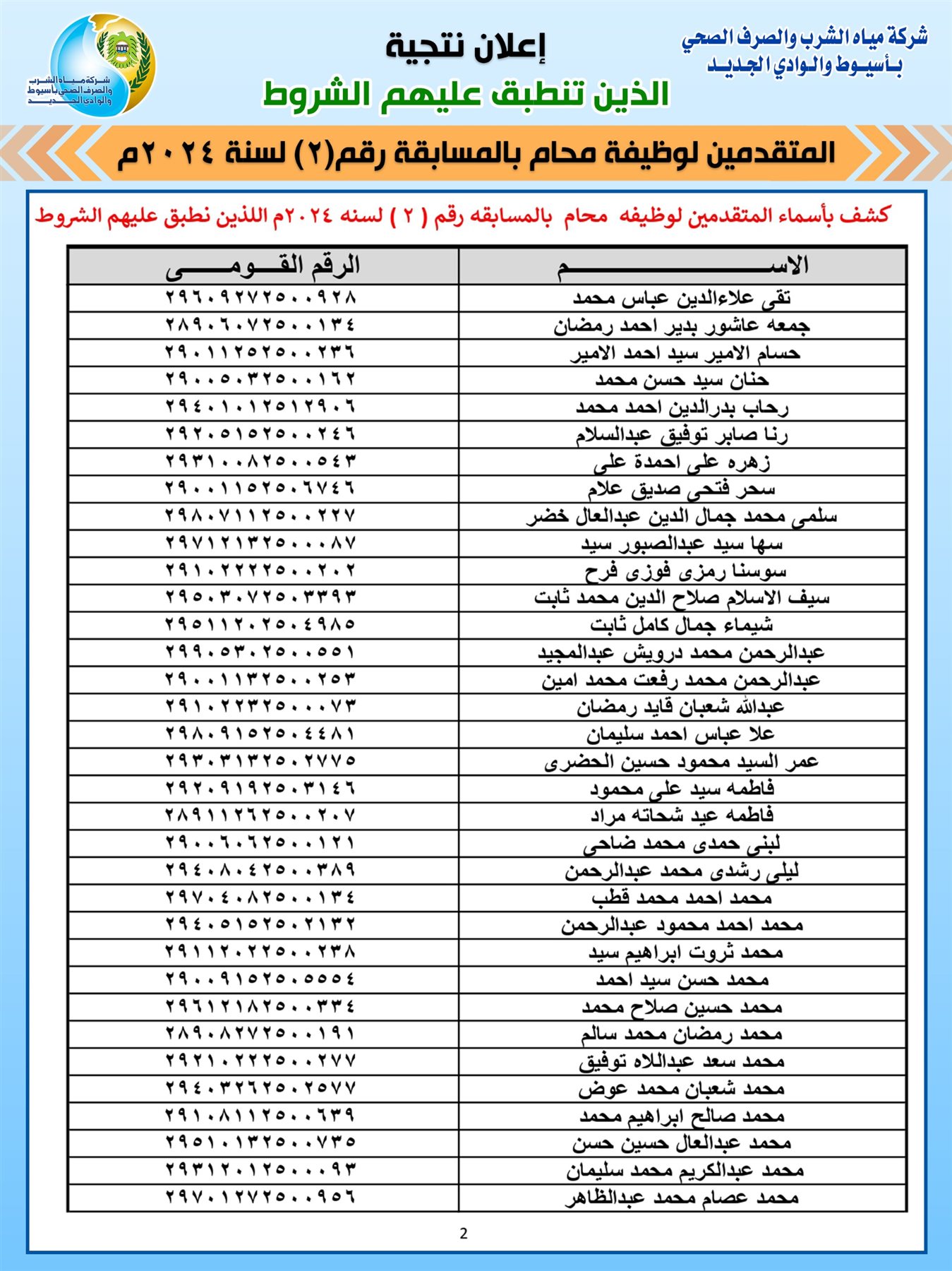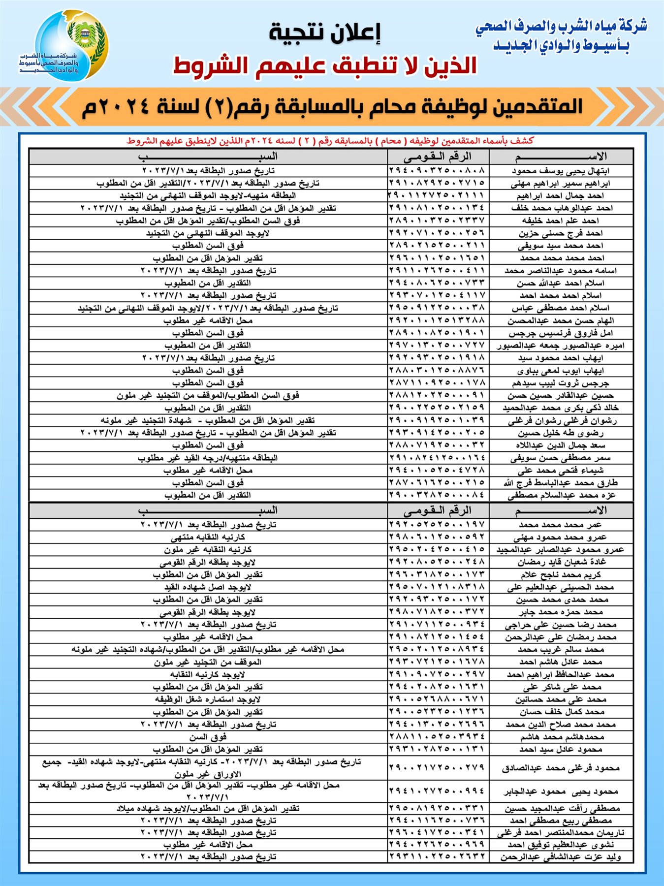 بالكشوف، أسماء المنطبق عليهم شروط القبول بمسابقة مياه أسيوط