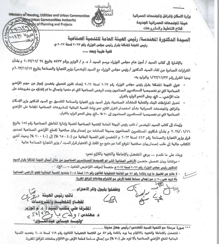 وافقت هيئة المجتمعات العمرانية على زيادة النسبة البنائية للأراضي الصناعية بألا تزيد عن 70 % من إجمالي مساحة الأرض مع الالتزام بمقننات المرافق المقررة.
