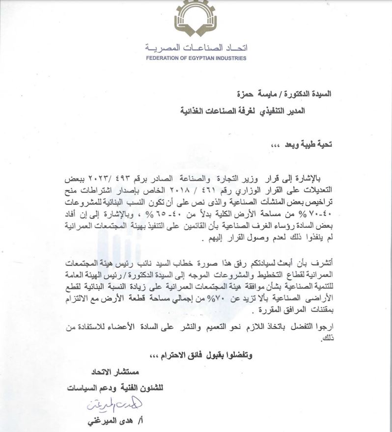 وذكر الخطاب الذى حصلت فـيتـو على نسخة منه "تتولى اللجنة المشكلة بقرار رئيس مجلس الوزراء رقم 2067 لسنة 2022 إعداد تقرير تفصيلى يتضمن حجم الاراضى الصناعية التى تم تخصيصها للمستثمرين الصناعيين وعدد الرخص الصناعية التى تم منحها واجمالى ما تم انشاؤه من مشروعات على هذه الاراضى.