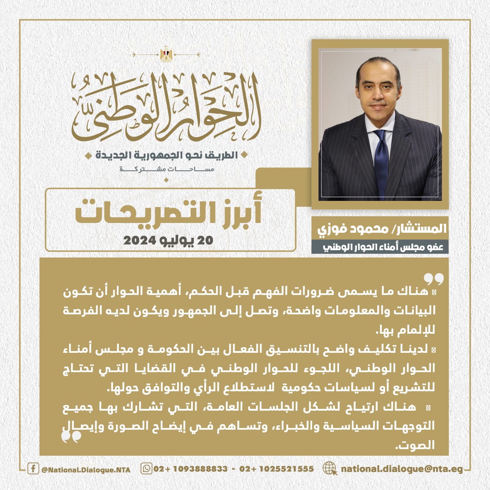 وأضاف محمود فوزى:" لدينا تكليف واضح بالتنسيق الفعال بين الحكومة ومجلس أمناء الحوار الوطنى، اللجوء للحوار الوطنى في القضايا التي تحتاج للتشريع أو لسياسات حكومية لاستطلاع الرأي والتوافق حولها، هناك ارتياح لشكل الجلسات العامة التي تشارك بها جميع التوجهات السياسية والخبراء وتساهم في إيضاح الصورة وإيصال الصوت".