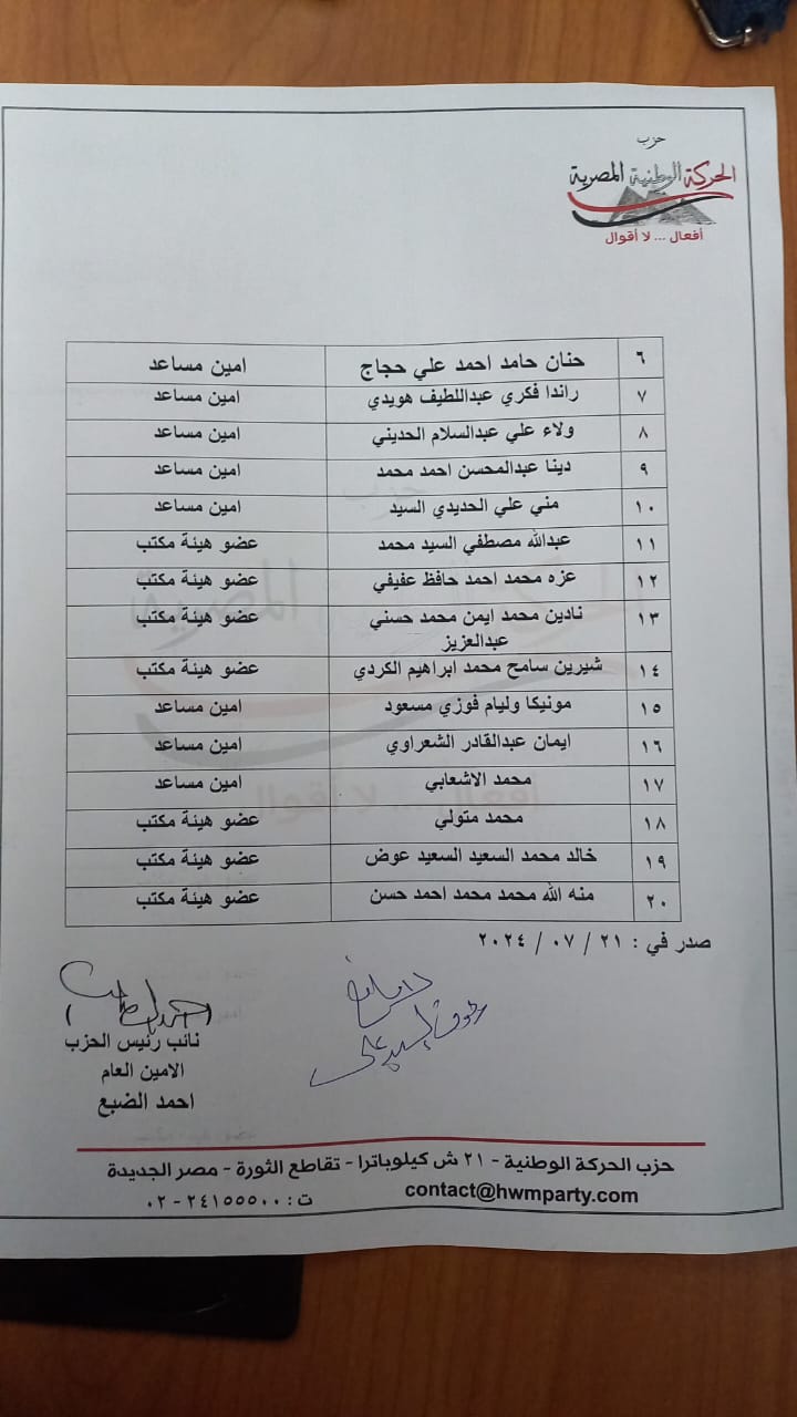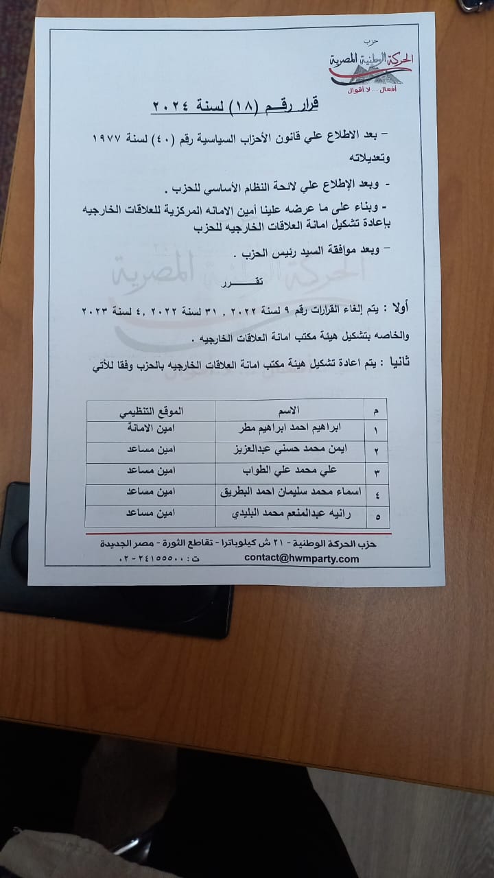 وافق اللواء رؤوف السيد علي رئيس حزب الحركة الوطنية المصرية علي إعادة تشكيل أمانة العلاقات الخارجية بالحزب، وضم حنان حامد حجاج أمينًا مساعدا للأمانة، وإلغاء القرار رقم “ 9 “ الصادر في 2022 بشأن التشكيل السابق لأمانة العلاقات الخارجية.