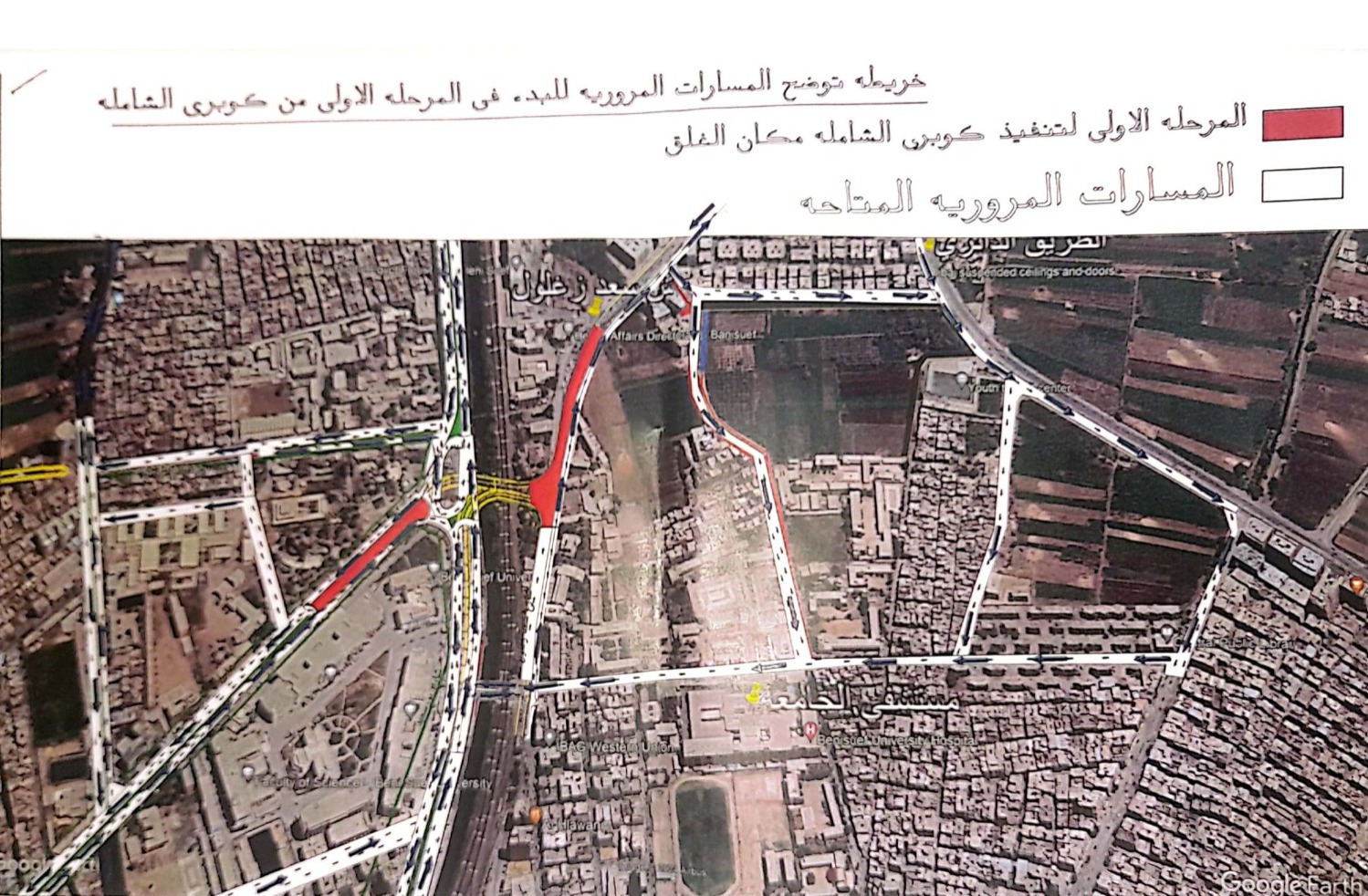 ننشر خرائط المسارات المرورية الجديدة للبدء في كوبري الشاملة ببني سويف