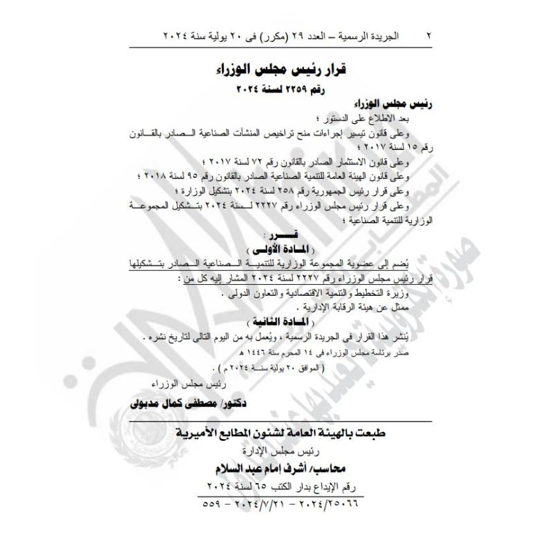 رئيس مجلس الوزراء ، أصدر الدكتور مصطفى مدبولي، رئيس مجلس الوزراء، قرارا بضم وزارة التخطيط والتعاون الدولي وممثل عن الرقابة الإدارية إلى عضوية المجموعة الوزارية للتنمية الصناعية، وفق قرار نشر في الجريدة الرسمية.