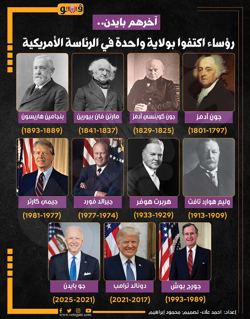 آخرهم بايدن.. رؤساء اكتفوا بولاية واحدة في الرئاسة الأمريكية (إنفوجراف) الإثنين 22/يوليو/2024 - 11:00 م 7/22/2024 11:00:03 PM بايدن، فيتو احمد علاء شارك طباعة 18 حجم الخط شارك طباعة الرئاسة الأمريكية جو بايدن دونالد ترامب جورج بوش جيمي كارتر انتخابات الرئاسة الأمريكية