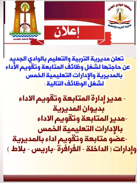 أعلنت مديرية التربية والتعليم بمحافظة الوادي الجديد، حاجتها لشغل وظائف المتابعة وتقويم الأداء بالمديرية والإدارات التعليمية الخمس.