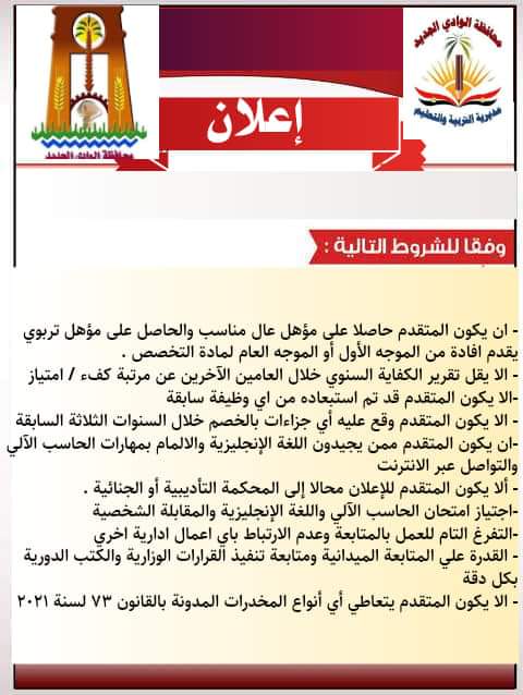 وأوضح وكيل تعليم الوادي الجديد، أن الإعلان وفقا للشروط التالية: