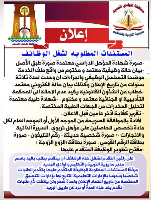 وحول المستندات المطلوبة لشغل الوظائف، أعلنت مديرية التربية والتعليم بالوادي الجديد، ضرورة إحضار