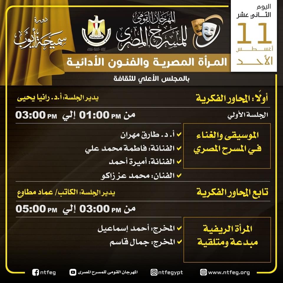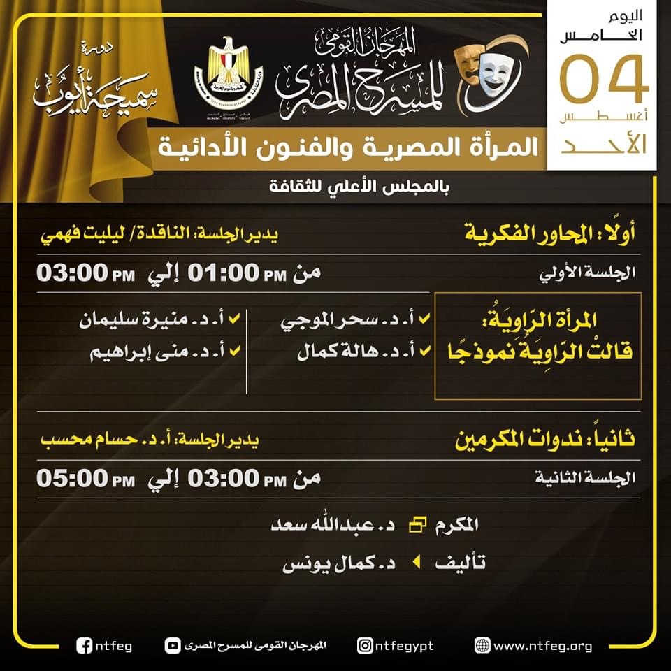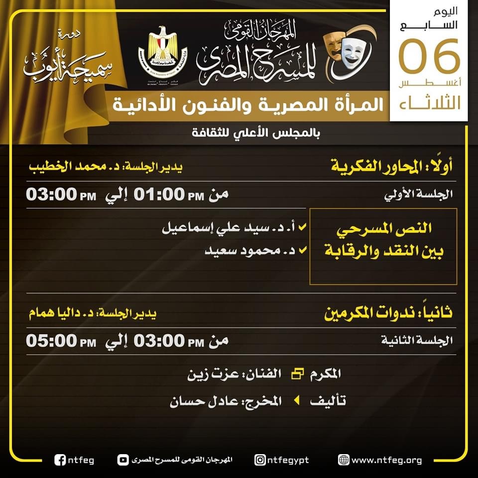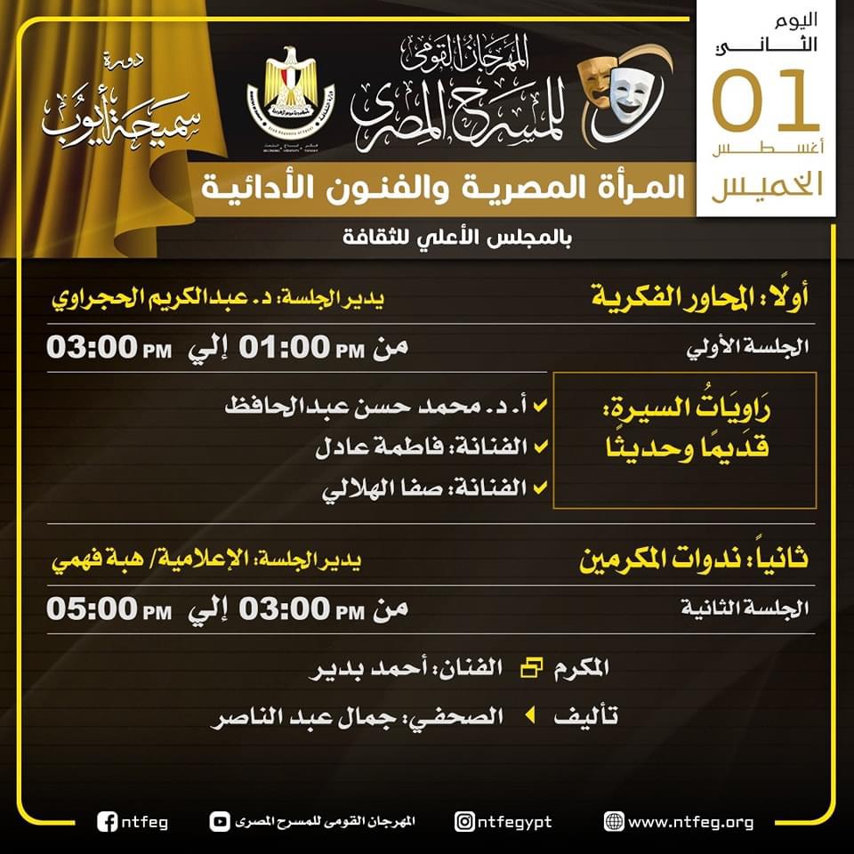 ويتضمن البرنامج ندوات للمكرمين خلال المهرجان، وكذلك محورا لمناقشة التحديات المسرحية على الساحة، وإلى جدول المحاور الفكرية والندوات كالتالي: