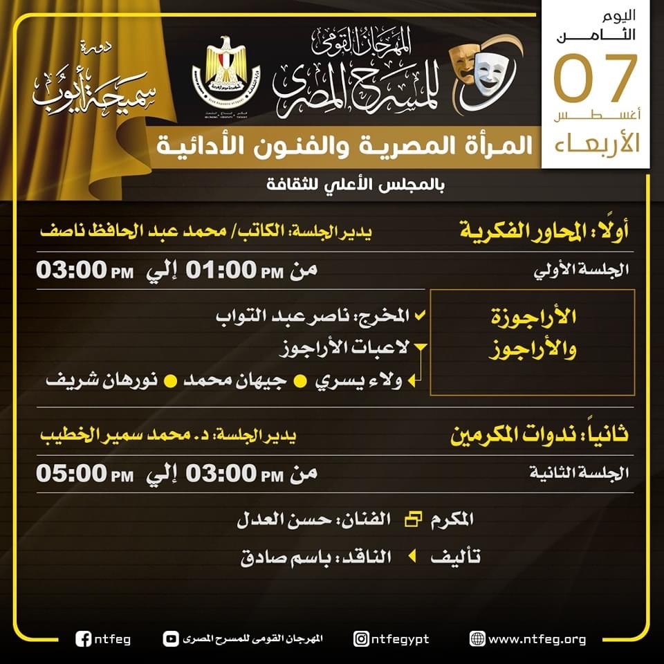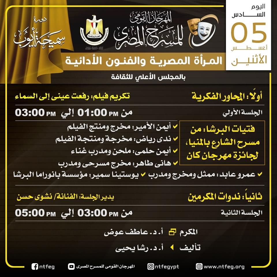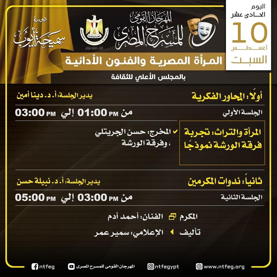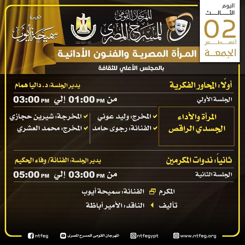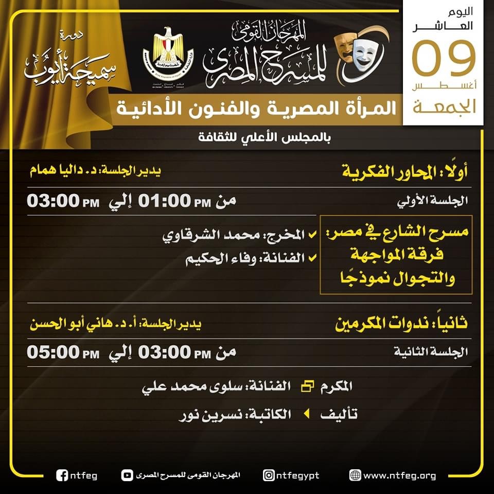 ويتضمن البرنامج ندوات للمكرمين خلال المهرجان، وكذلك محورا لمناقشة التحديات المسرحية على الساحة، وإلى جدول المحاور الفكرية والندوات كالتالي:
