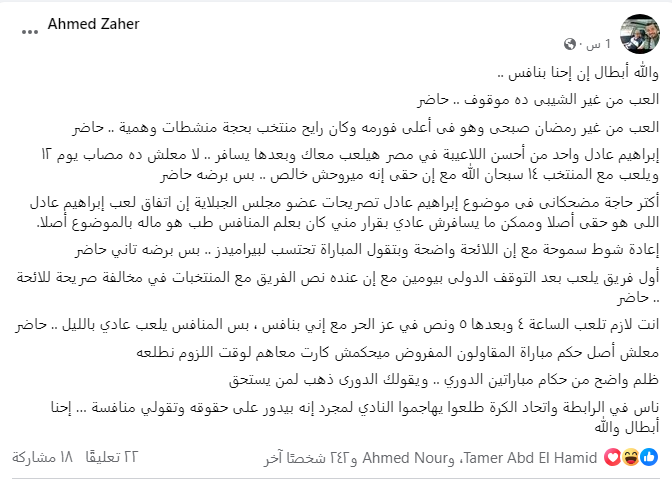 ونشر زاهر عبر حسابه الشخصي بموقع التواصل الاجتماعي "فيسبوك":والله أبطال إن إحنا بنافس..العب من غير الشيبى ده موقوف.. حاضر..العب من غير رمضان صبحى وهو فى أعلى فورمه وكان رايح منتخب بحجة منشطات وهمية.. حاضر"