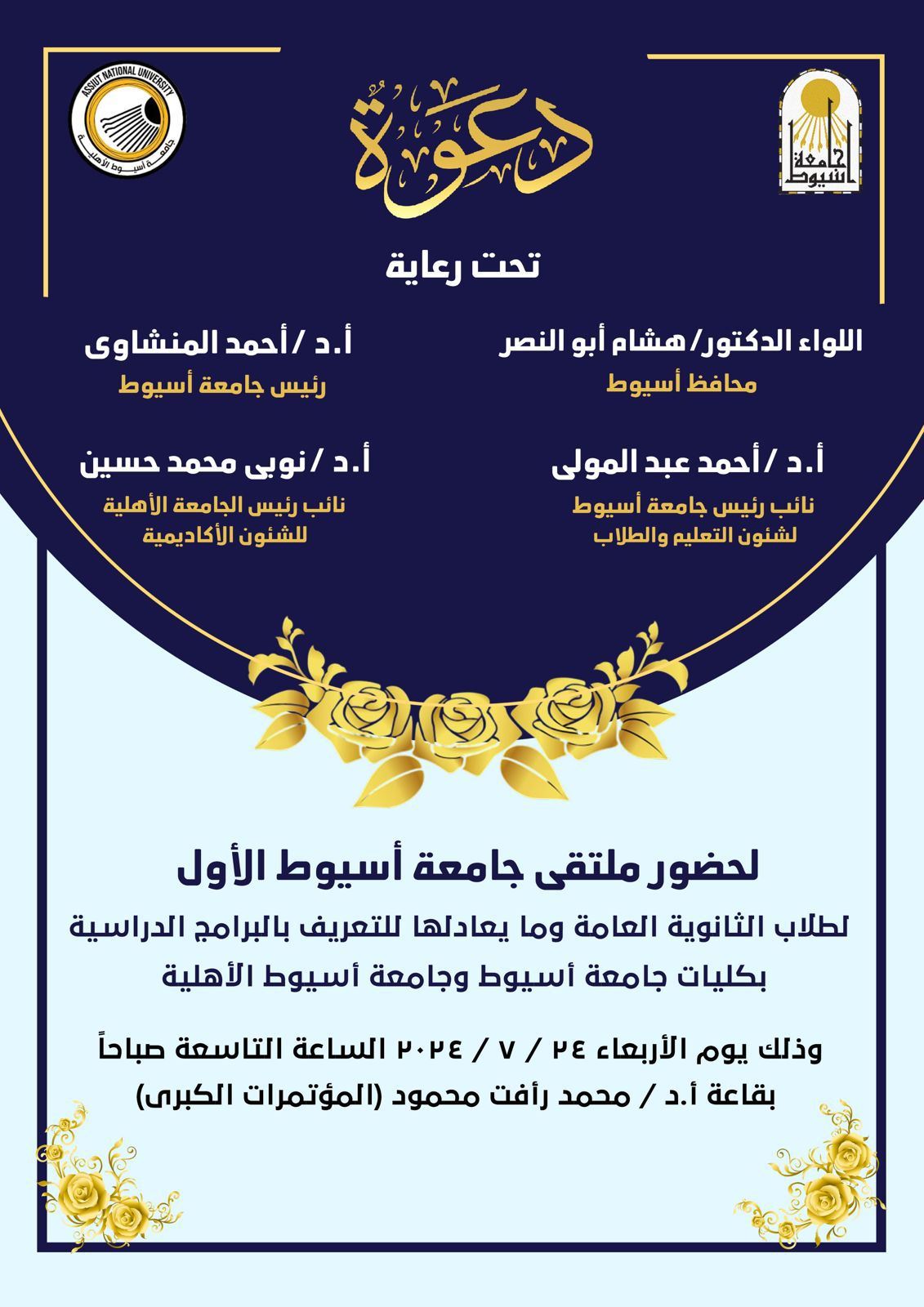 تطلق جامعة أسيوط، غدًا الأربعاء، الموافق ٢٤ من يوليو، في تمام الساعة التاسعة صباحًا، بقاعة المؤتمرات الكبرى، فعاليات ملتقى جامعة أسيوط الأول؛ لطلاب الثانوية العامة، وما يعادلها؛ للتعريف بالبرامج الدراسية، بكليات الجامعة، وجامعة أسيوط الأهلية.