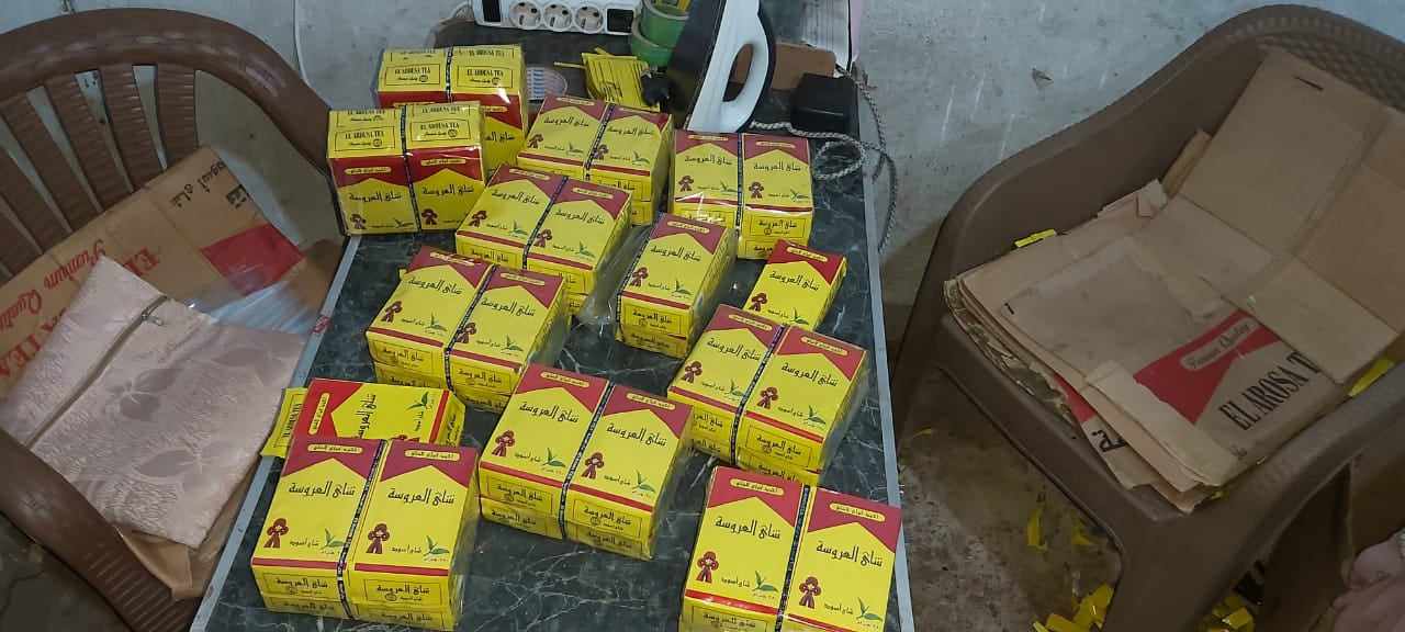 - ضبط 13 شيكارة شاي أسود ناعم (جاري تعبئته) وزن الشيكارة 70 كيلو بإجمالي 910 كيلو.