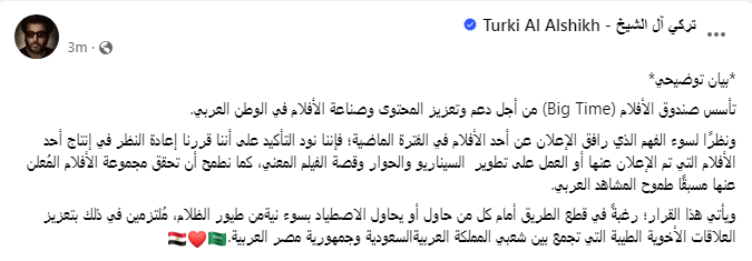 وقال المستشار تركي آل الشيخ: "بيان توضيحي.. تأسس صندوق الأفلام (Big Time) من أجل دعم وتعزيز المحتوى وصناعة الأفلام في الوطن العربي."