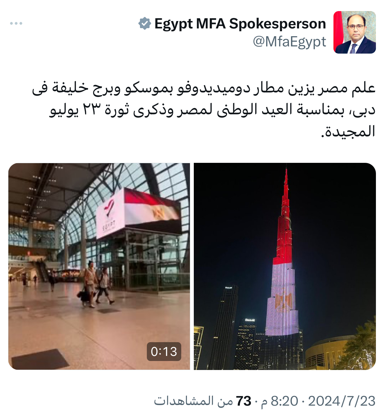 قال المتحدث الرسمي باسم وزارة الخارجية السفير أحمد أبو زيد إن علم مصر يزين مطار دوميديدوفو بموسكو وبرج خليفة فى دبى، بمناسبة ذكرى ثورة ٢٣ يوليو المجيدة.