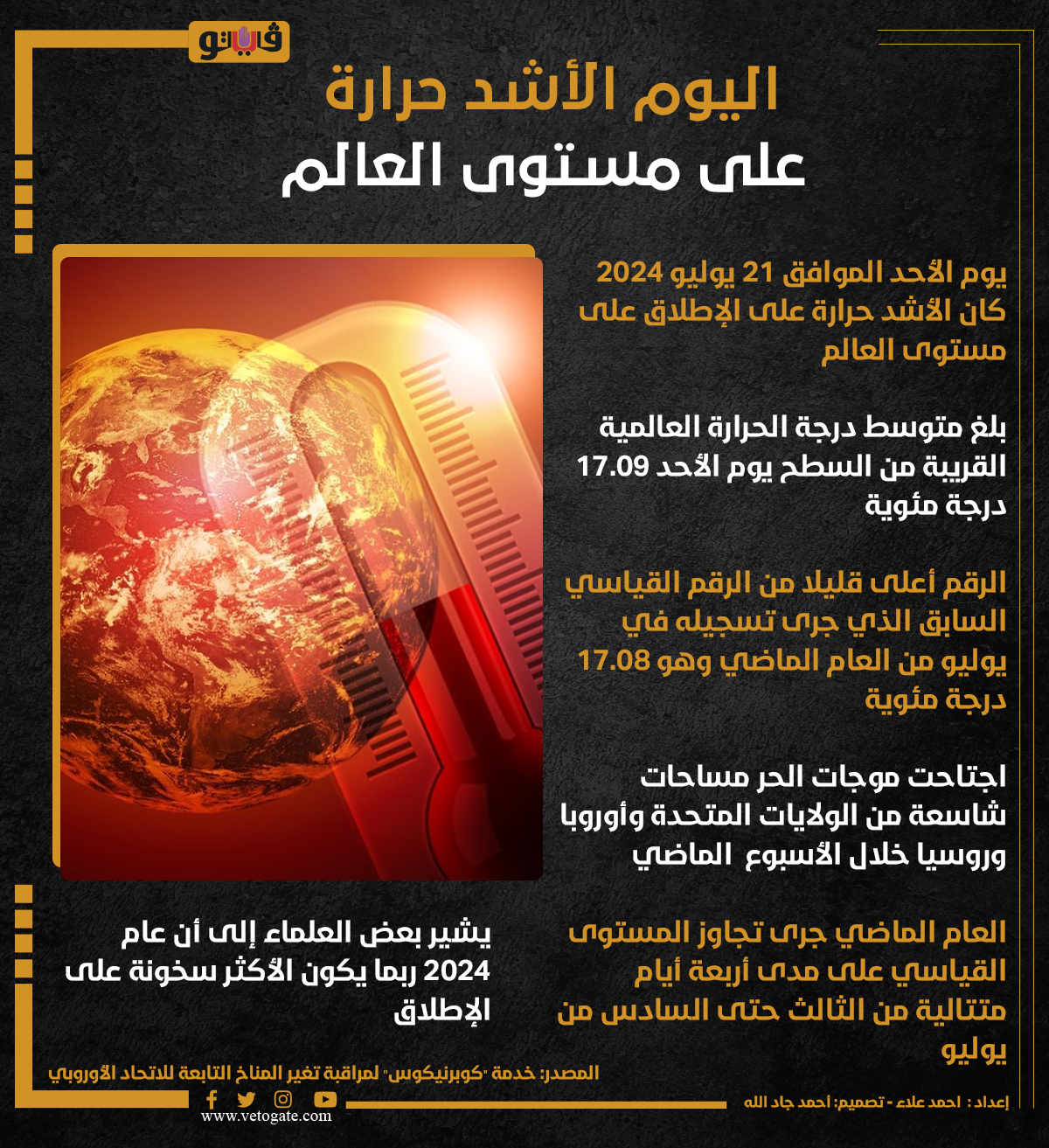 اليوم الأشد حرارة على مستوى العالم (إنفوجراف) الأربعاء 24/يوليو/2024 - 01:00 م 7/24/2024 1:00:51 PM ارتفاع درجات الحرارة، فيتو احمد علاء شارك طباعة 18 حجم الخط شارك طباعة الولايات المتحدة أوروبا روسيا درجة الحرارة العالمية الاتحاد الاوروبي تغير المناخ