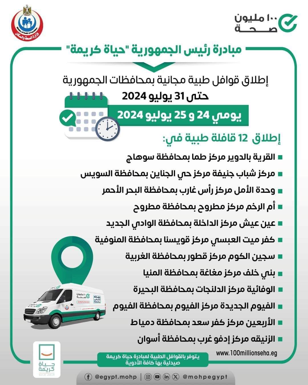 جدير بالذكر، أن القافلة ضمن خطة القوافل العلاجية التي تنظمها وزارة الصحة والسكان في جميع التخصصات بالقرى والنجوع الأكثر احتياجًا لتحسين مستوى الخدمات الطبية، وذلك في إطار المبادرة الرئاسية "حياة كريمة".