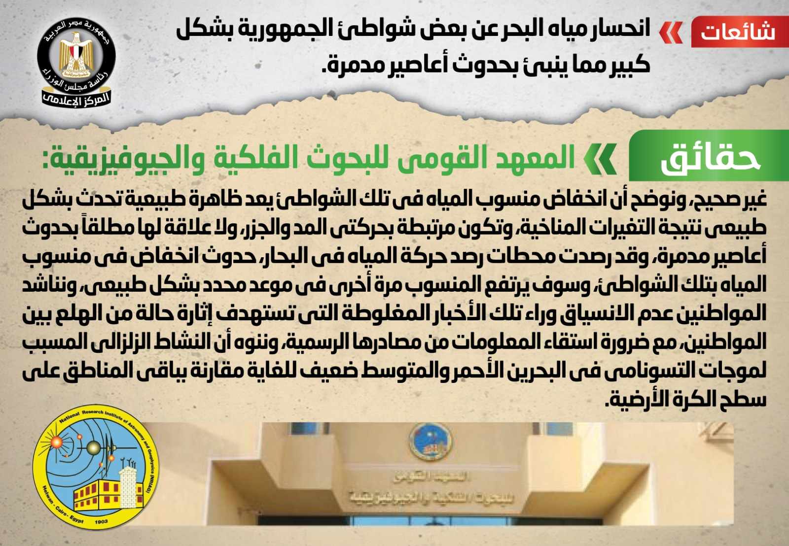 وقام المركز الإعلامي لـ مجلس الوزراء بالتواصل مع المعهد القومي للبحوث الفلكية والجيوفيزيقية، والذي نفى تلك الأنباء، مُؤكدًا أنه لا صحة لانحسار مياه البحر عن بعض شواطئ الجمهورية نتيجة موجات مد بحري (تسونامي) نتيجة وجود زلازل كبير في البحر المتوسط، موضحًا أن انخفاض منسوب المياه في تلك الشواطئ يعد ظاهرة طبيعية تحدث بشكل طبيعي نتيجة التغيرات المناخية، وتكون مرتبطة بحركتي المد والجزر، ولا علاقة لها مطلقًا بحدوث أعاصير مدمرة.